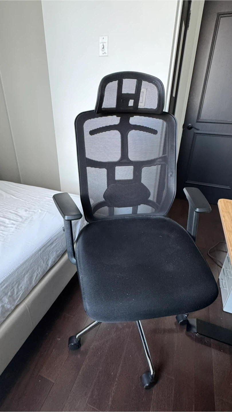 Selling a used ergonomic office chair in black. It's a mesh chair, perfect for staying cool during long work sessions. The chair has adjustable features for maximum comfort.