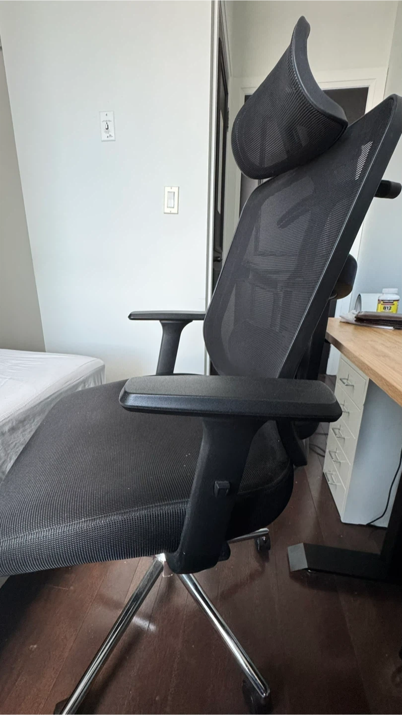 Selling a used ergonomic office chair in black. It's a mesh chair, perfect for staying cool during long work sessions. The chair has adjustable features for maximum comfort.