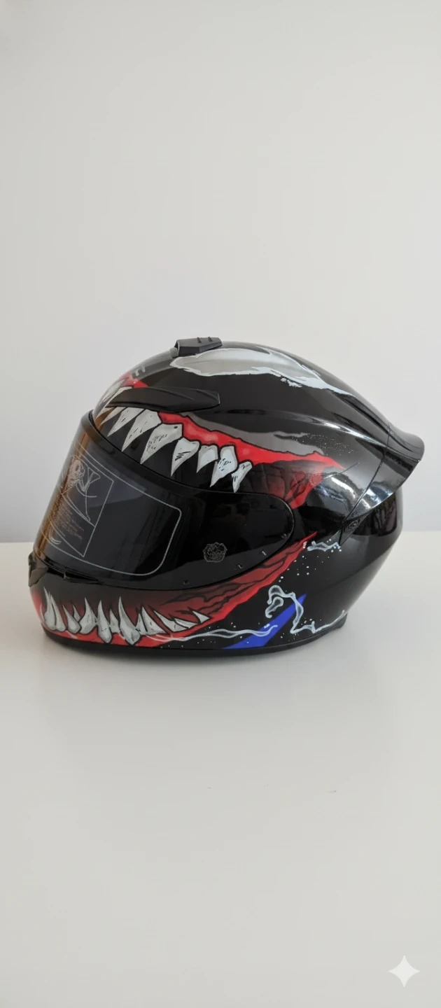 This full face motorcycle helmet features a striking Venom graphic design. It's constructed for protection and style. Includes a tinted visor for visibility.