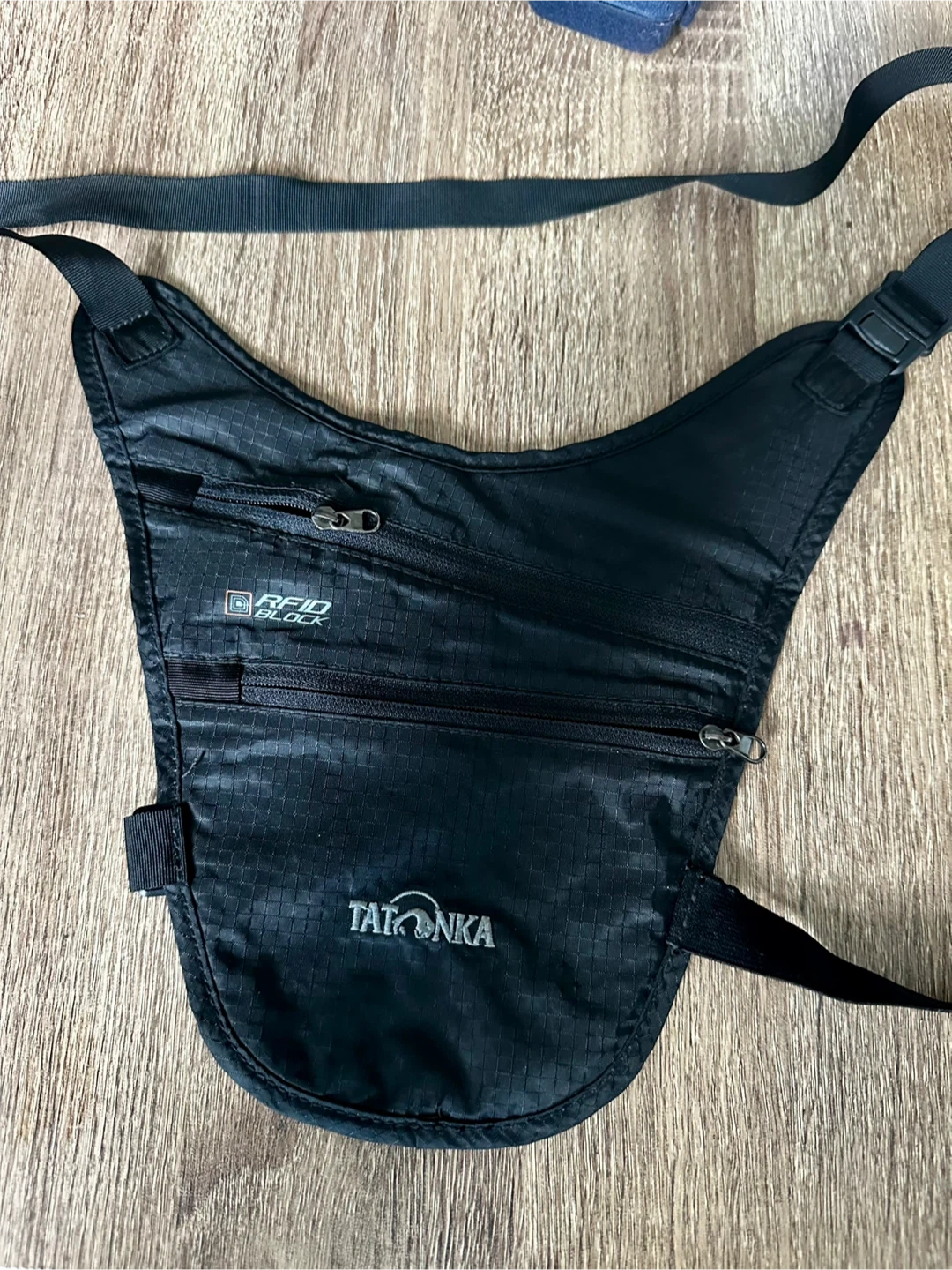Tatonka travel pouch with RFID BLOCK technology to protect your cards. It has multiple zippered compartments for secure storage. Adjustable strap for comfortable wear.