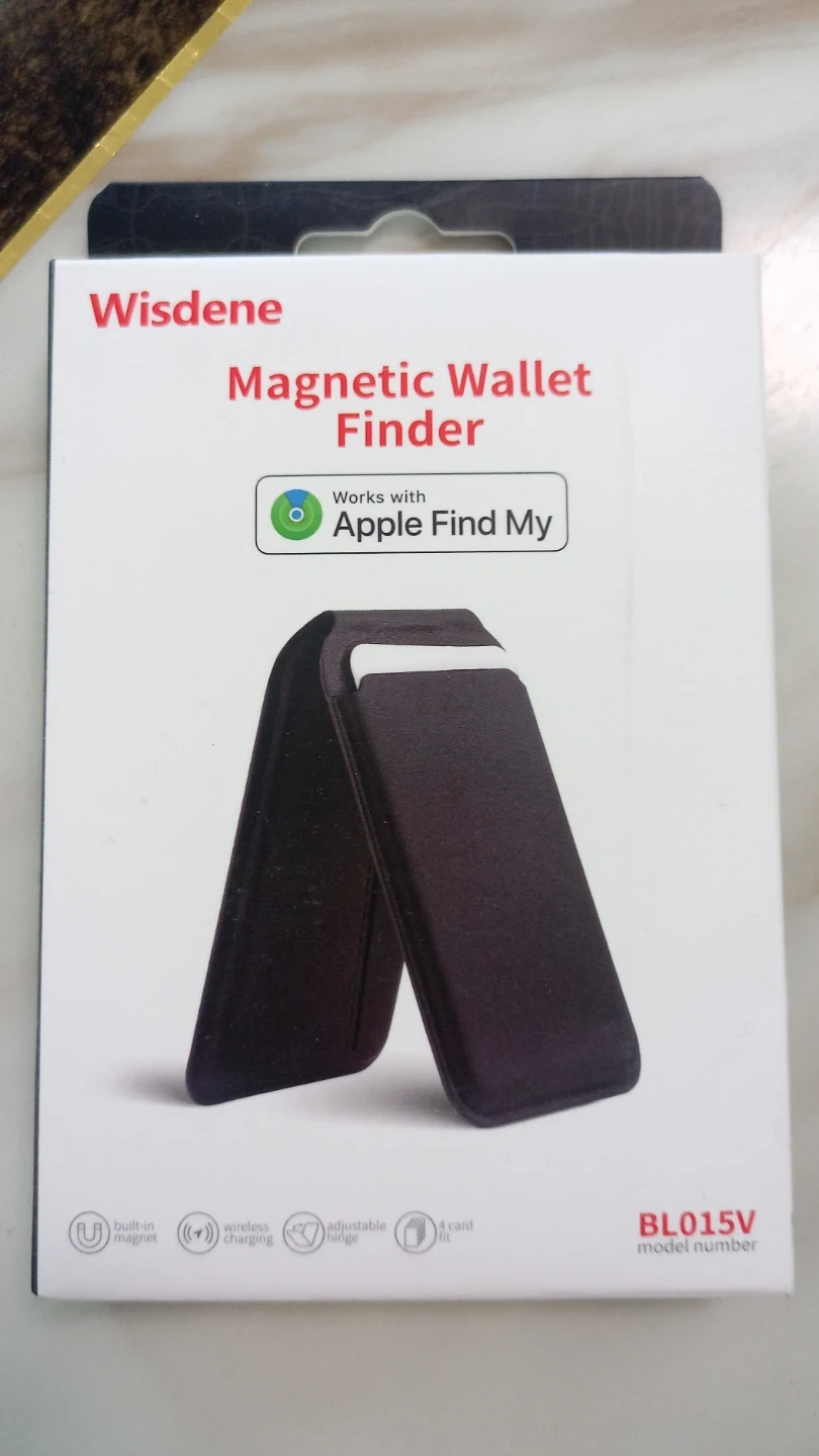 This is a Wisdene magnetic wallet finder that works with Apple Find My. It has a built-in magnet, supports wireless charging, and features an adjustable hinge with a 4-card fit. You can use it to keep track of your wallet!