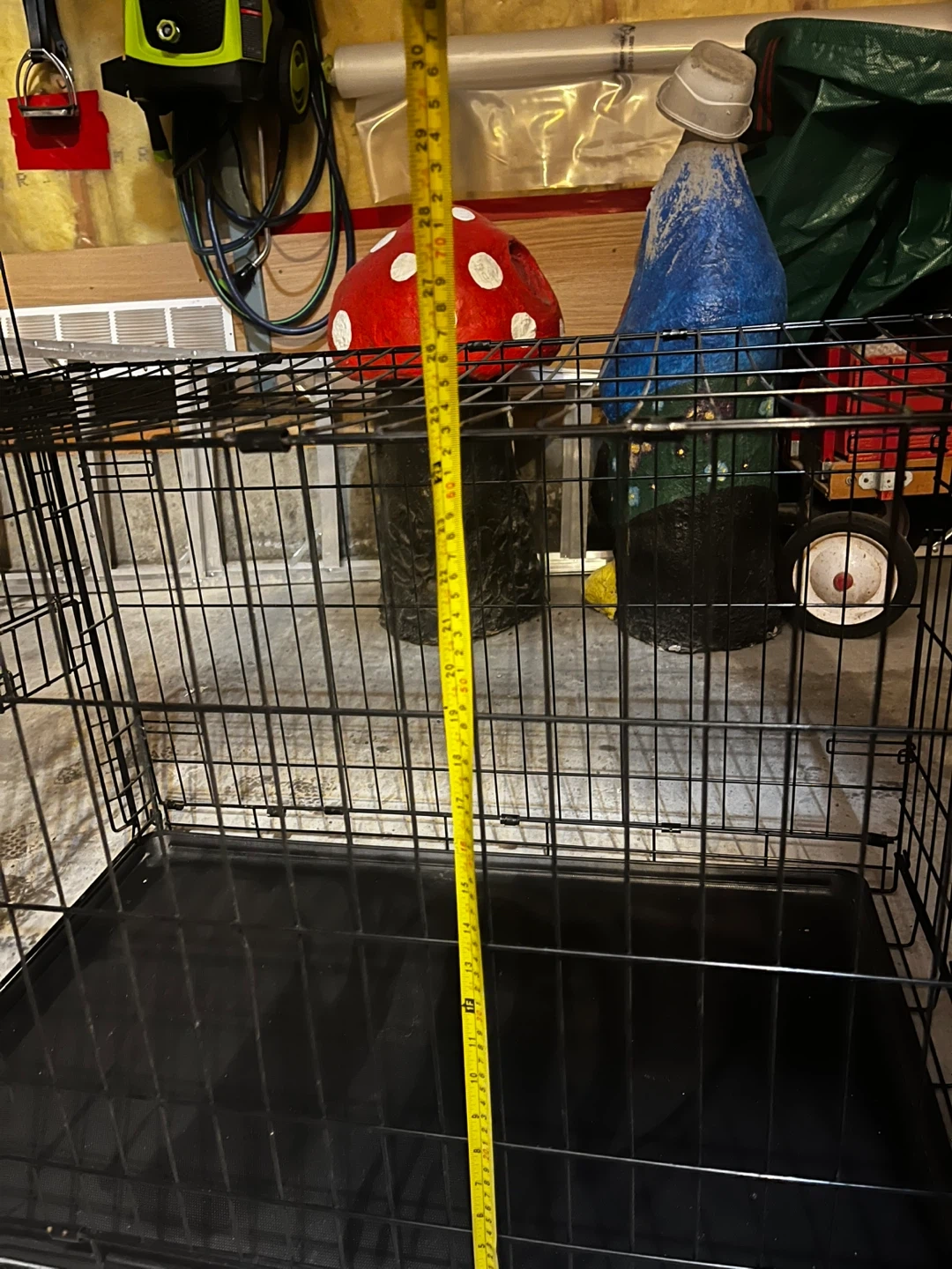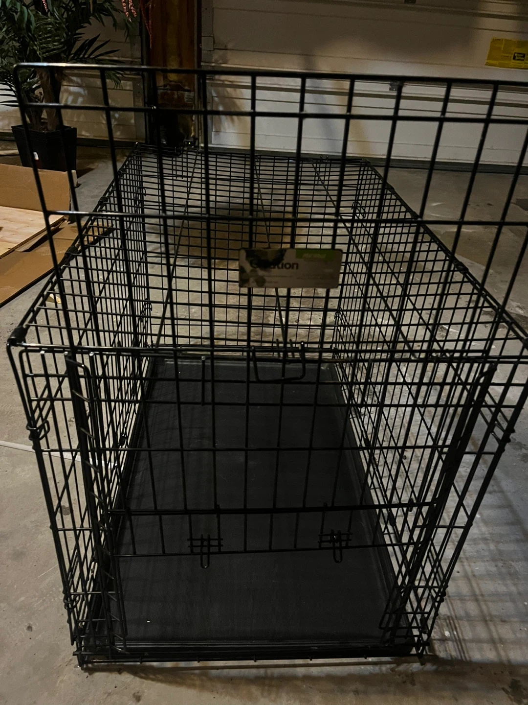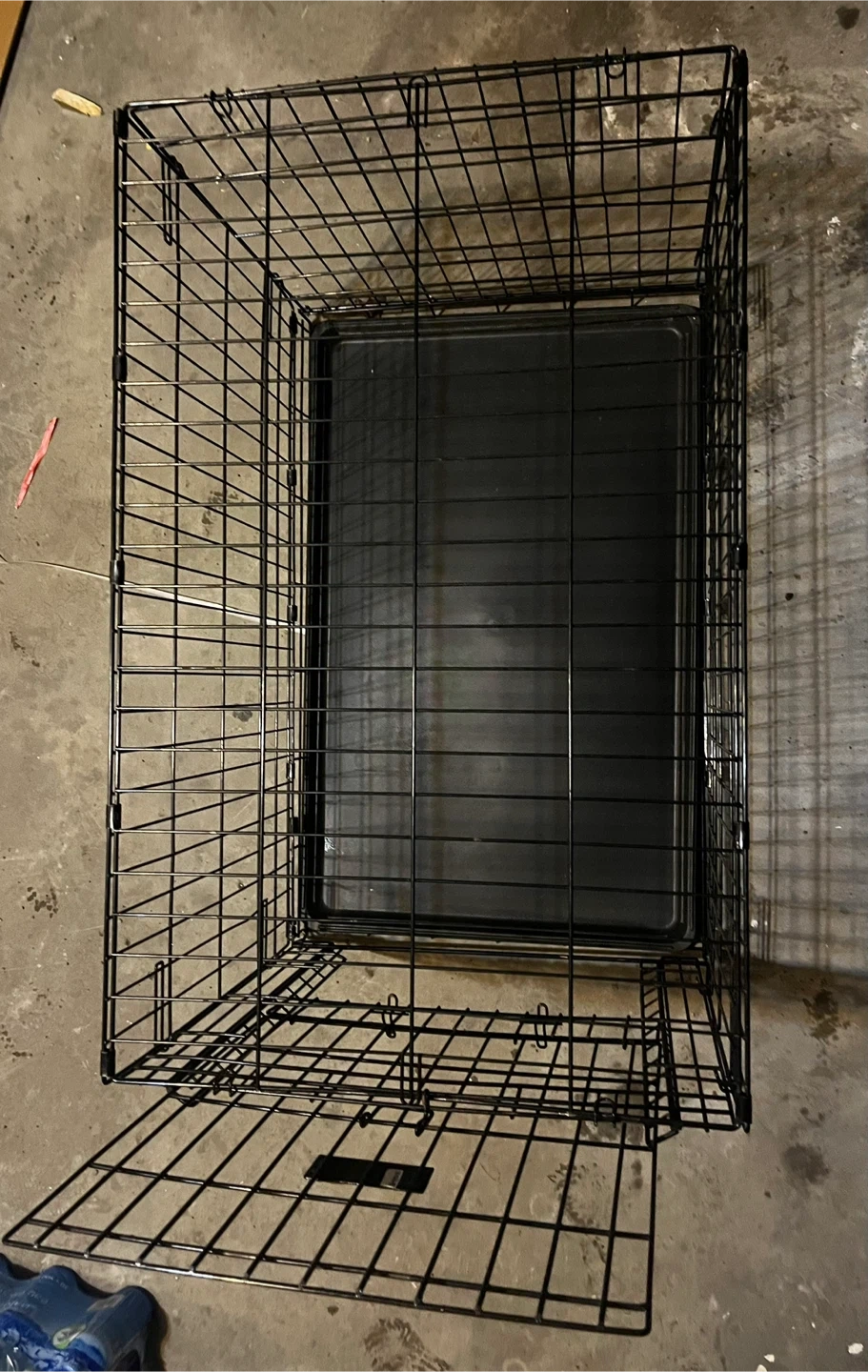 This is a black metal dog crate with a plastic tray .The crate is foldable for easy storage and transport. It's suitable for training or travel.