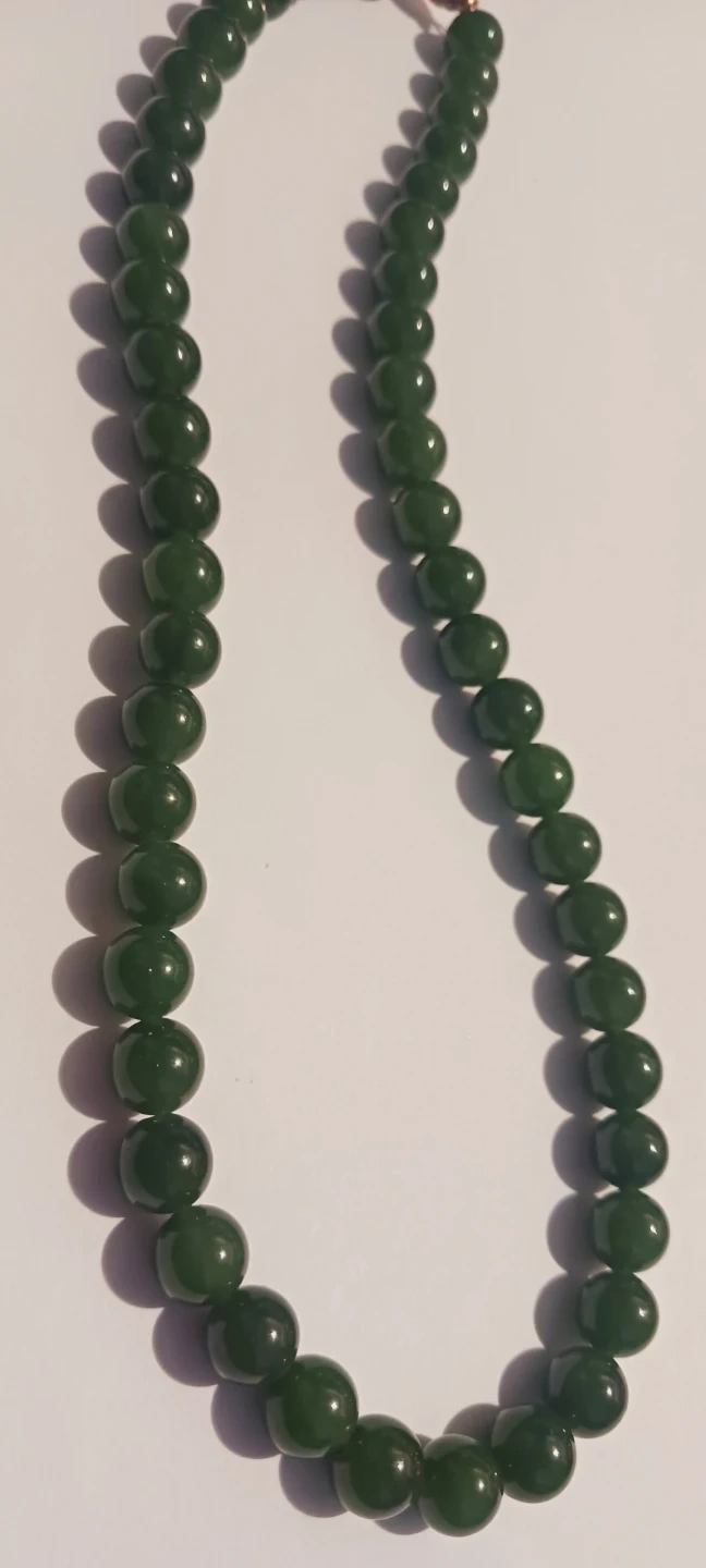 14 KARAT GOLD CLASP STAMPED GENUINE CHINESE JADE NECKLACE. 15" LONG. EXCELLENT CONDITION. ALL MY PRICES ARE NEGOTIABLE !!