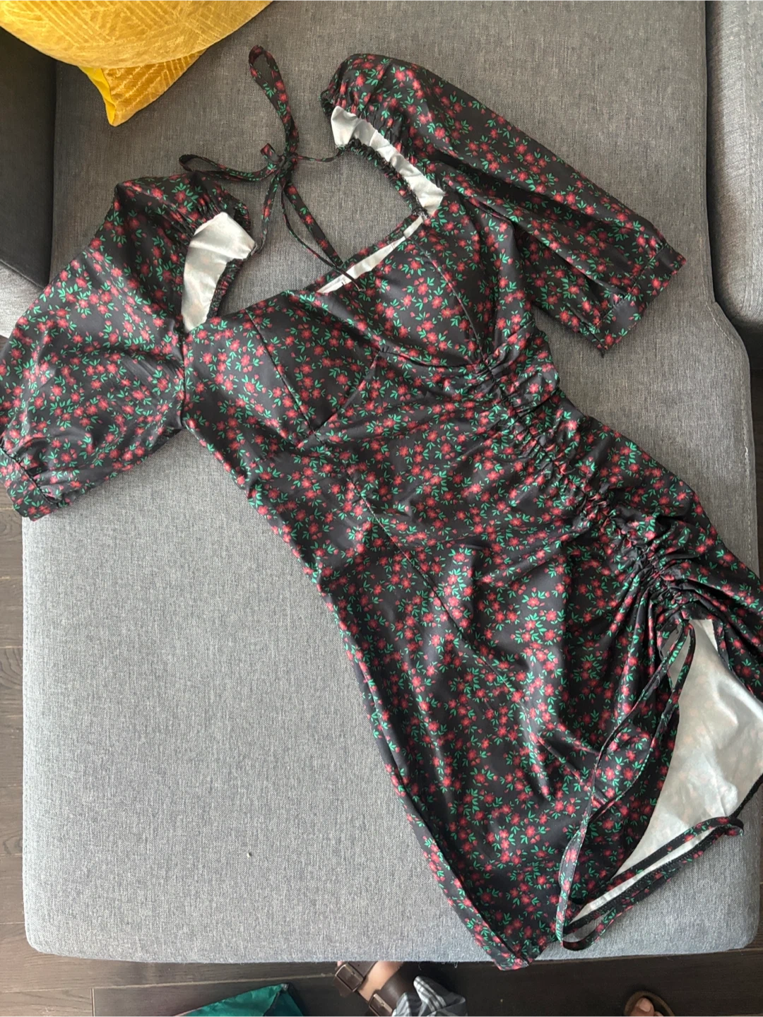 Black floral mini dress with ruched sides