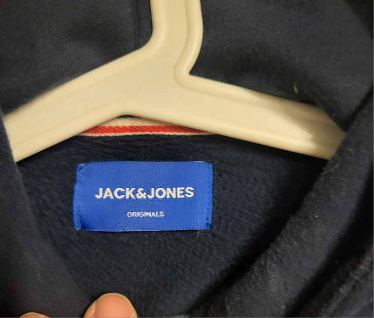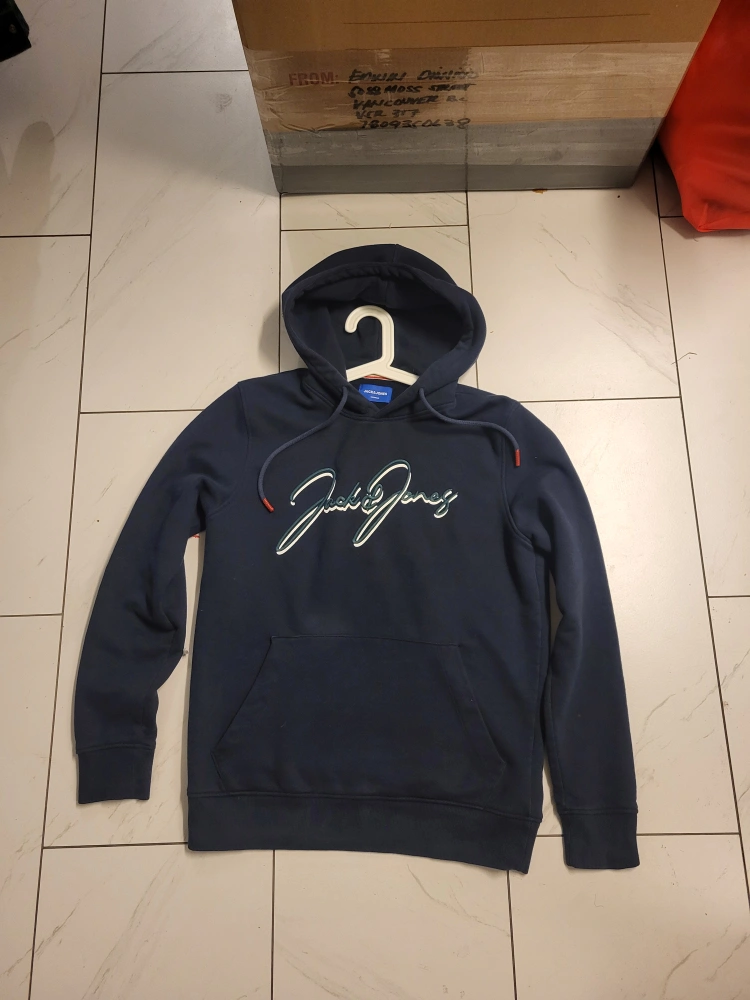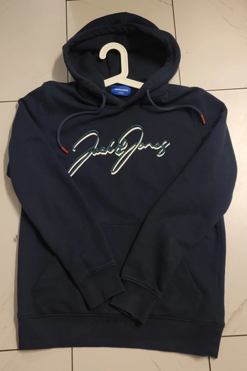 Navy blue hoodie. Features a signature Jack & Jones logo. Long sleeves, kangaroo pocket. Good for casual wear.