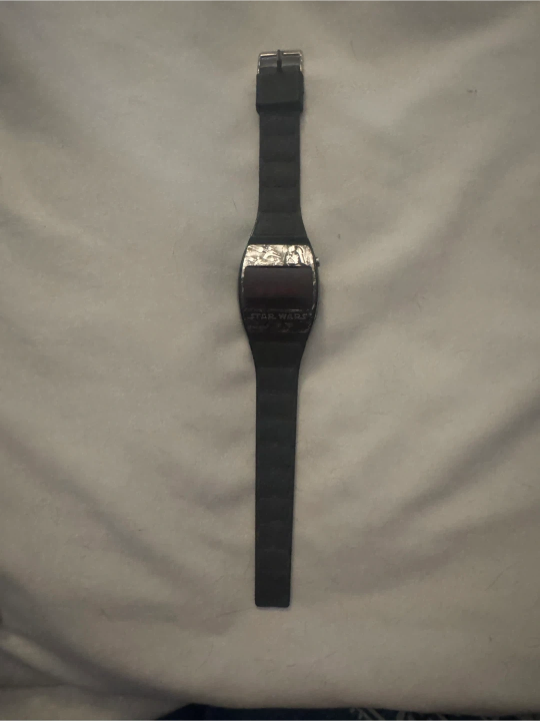 This is a black digital watch with a Star Wars design. It has a silicone band and a rectangular screen. The watch displays the time digitally.