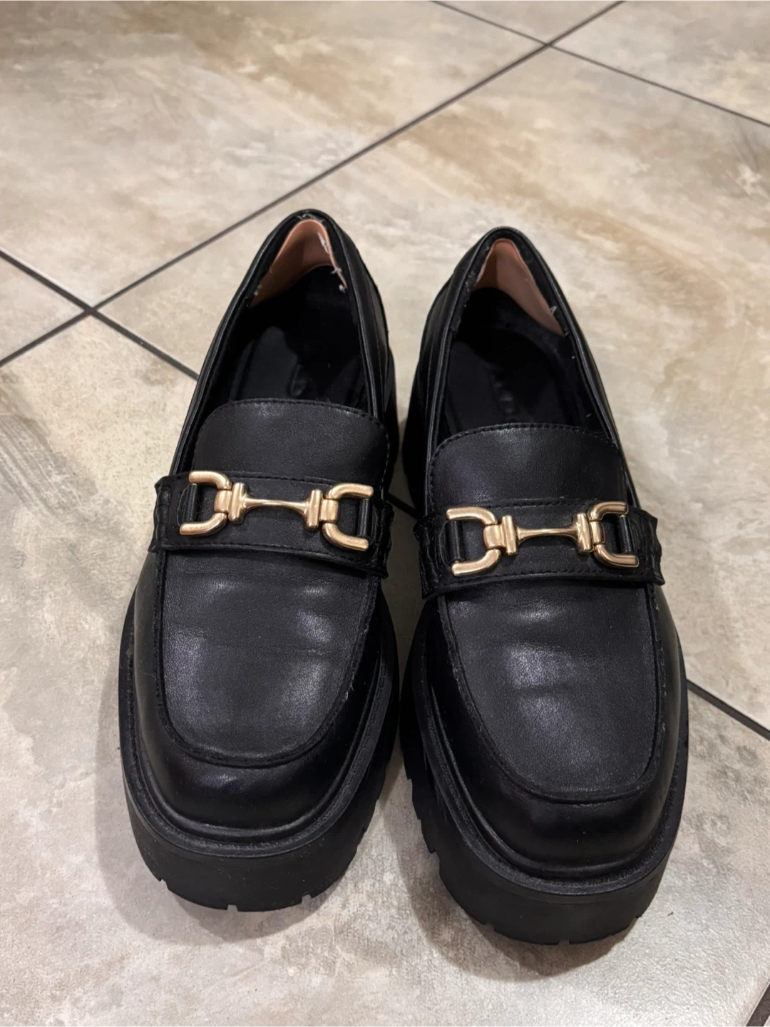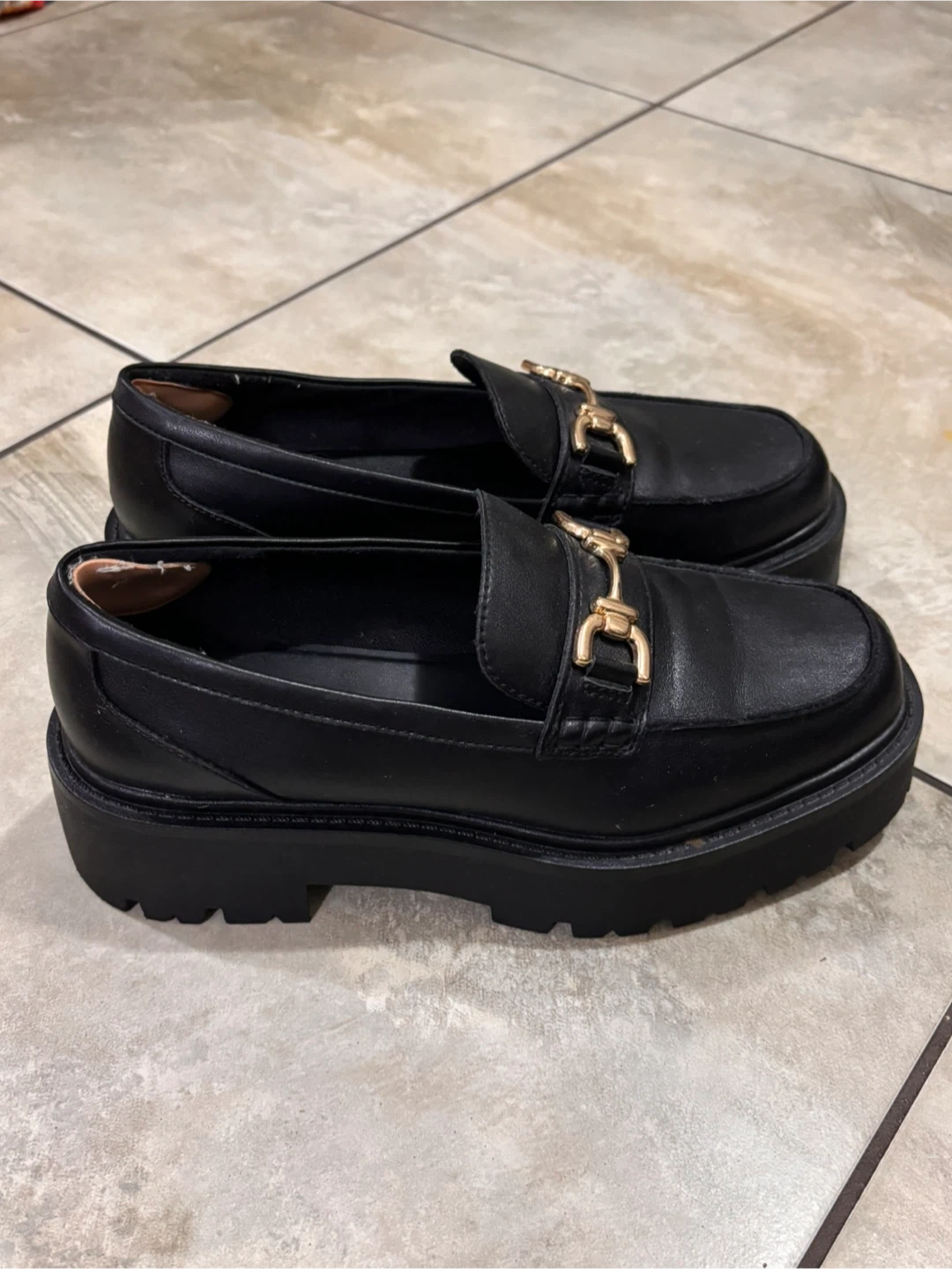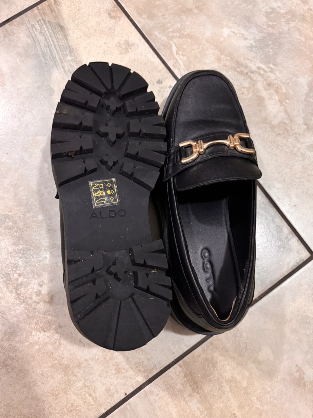 Stylish black loafers from ALDO, featuring a gold-tone horsebit detail. These have a trendy lug sole for added flair and comfort. They're a versatile addition to any wardrobe!