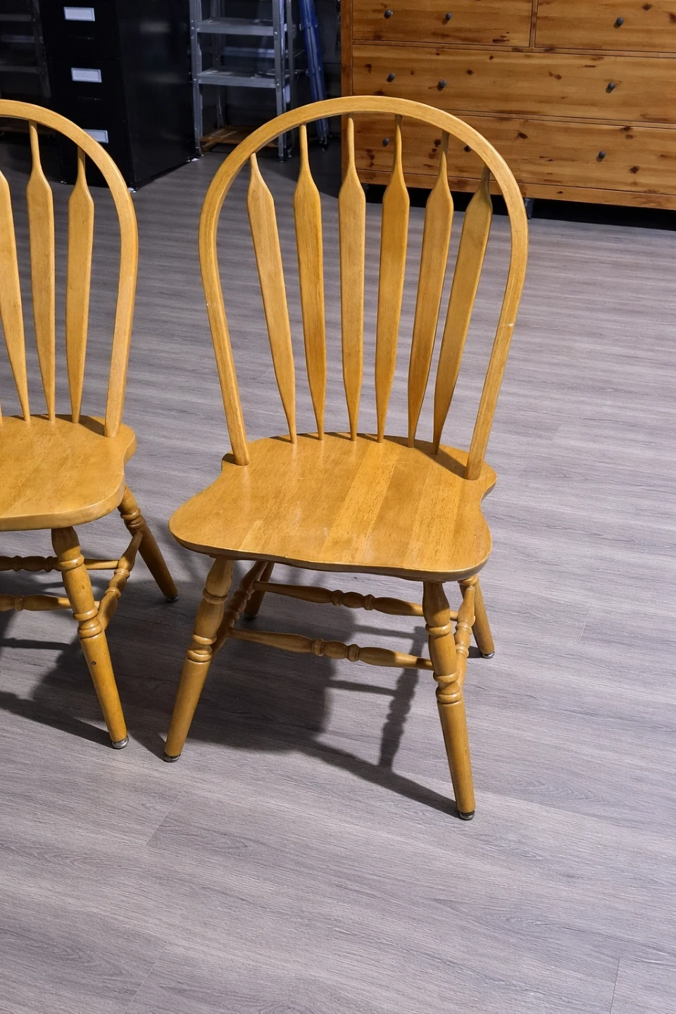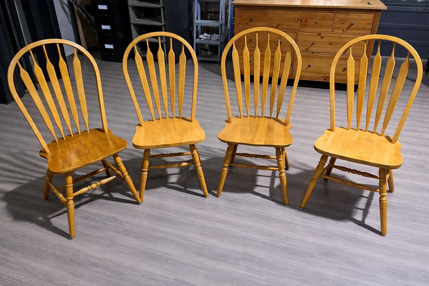 Set of four light wood dining chairs. These chairs feature a classic spindle-back design. Perfect for a kitchen or dining room! They're made of solid wood.