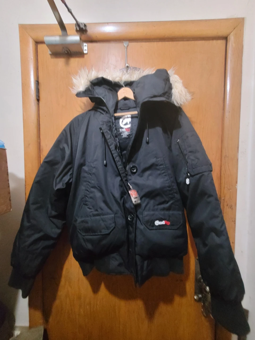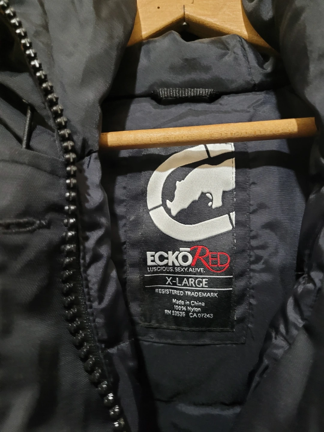 This is a black Ecko Red puffer jacket. It's a size X-Large and made with 100% nylon. It features a faux fur-lined hood. Perfect for keeping warm!