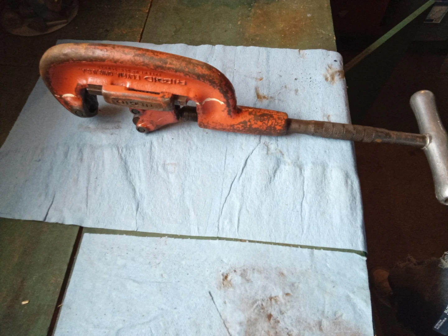 Orange RIDGID heavy-duty pipe cutter. Model No. 2A. Made in Elyria, Ohio, U.S.A. For cutting pipes up to 2 inches.