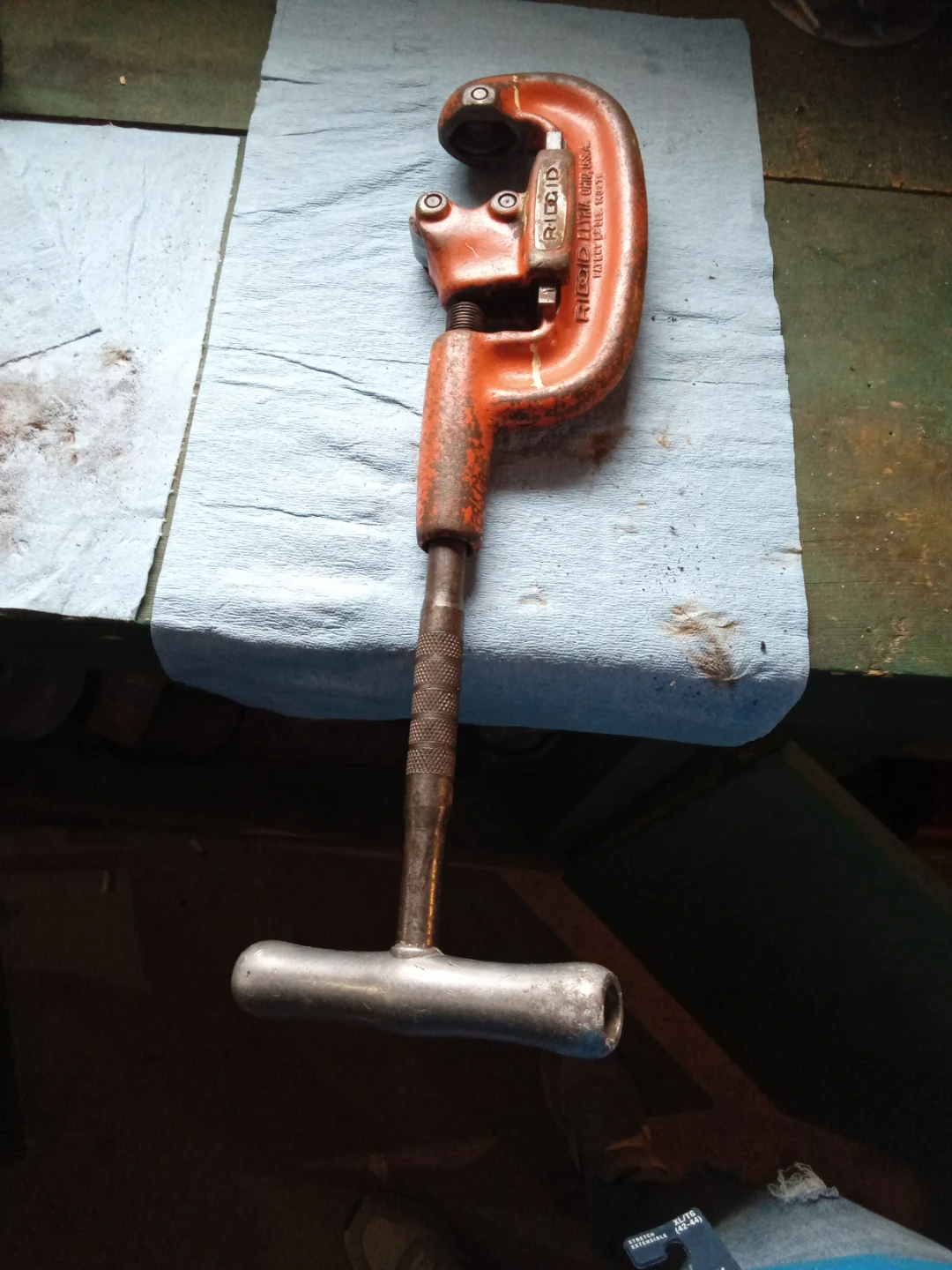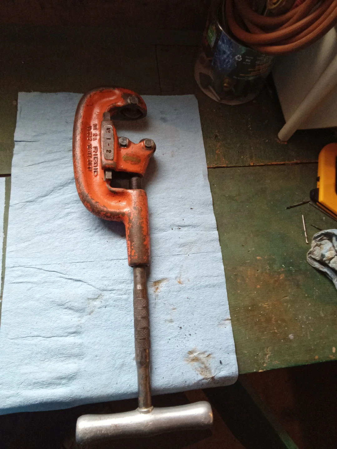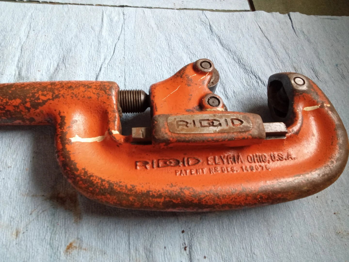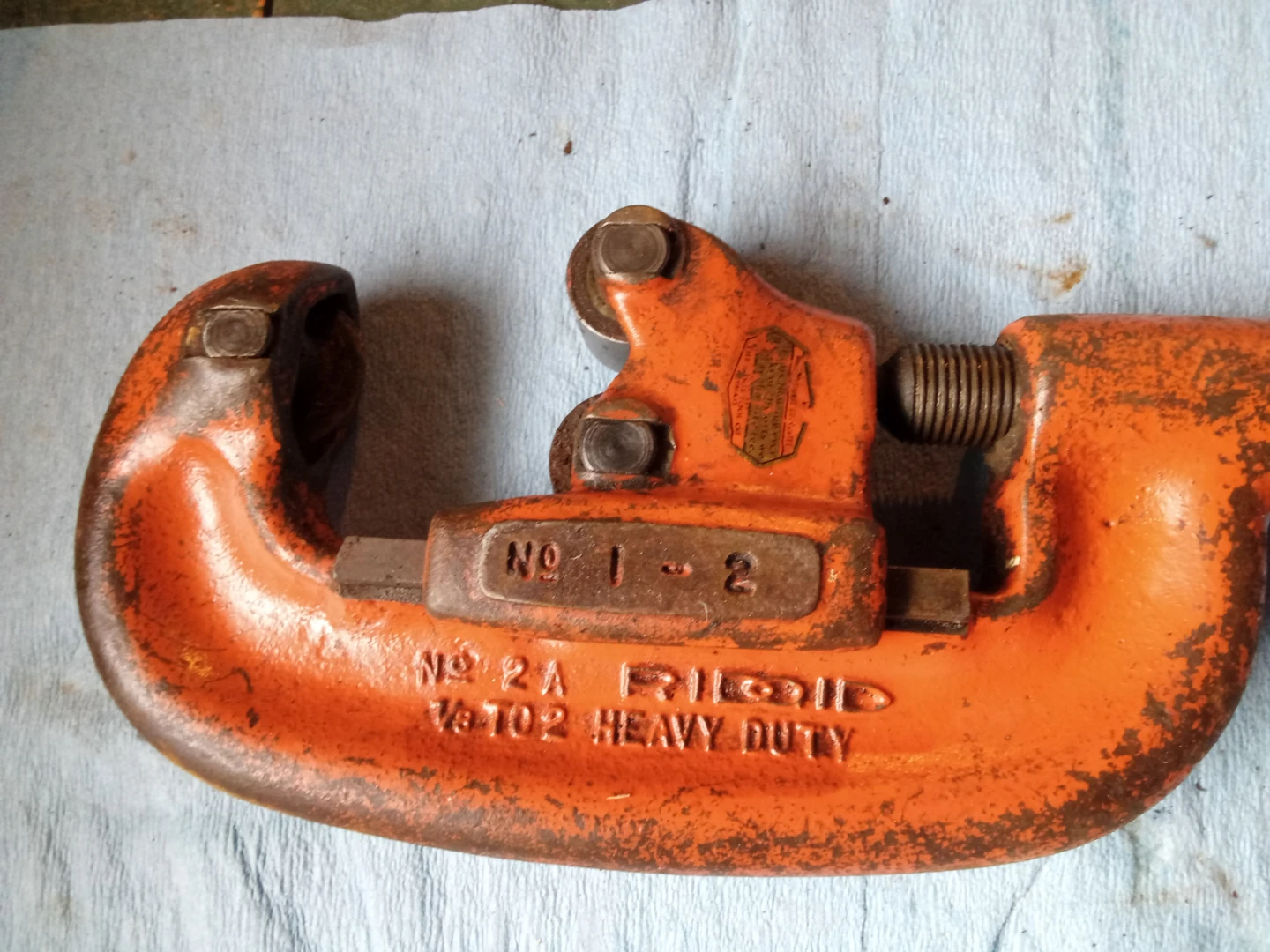 Orange RIDGID heavy-duty pipe cutter. Model No. 2A. Made in Elyria, Ohio, U.S.A. For cutting pipes up to 2 inches.