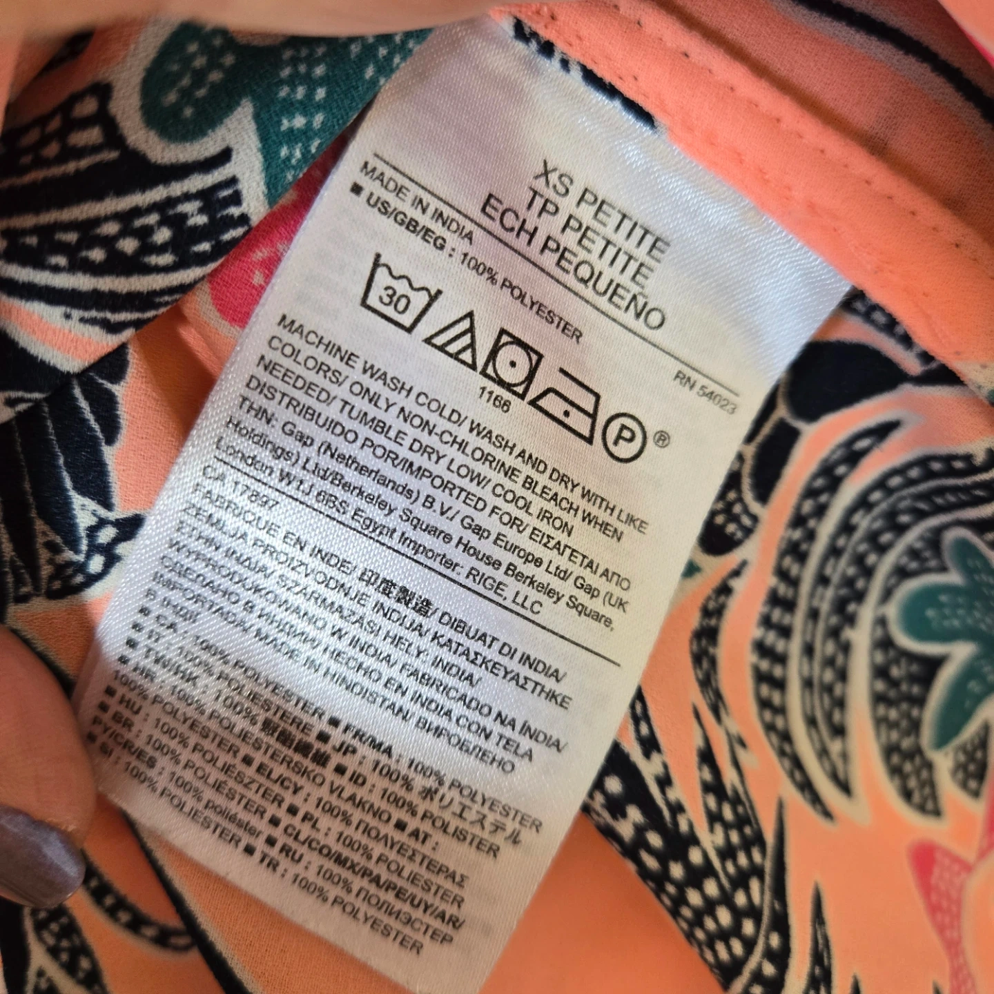 This Banana Republic blouse comes in a petite size XS. It's made of 100% polyester and features a vibrant floral and bird print. The button-up style is perfect for adding a pop of colour to any outfit!
