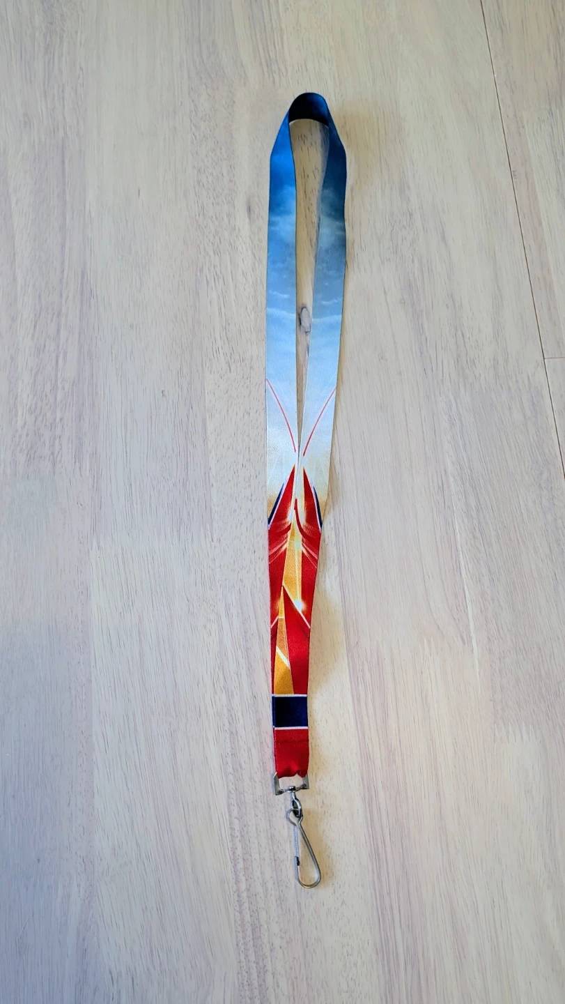 This lanyard features a bold graphic design with red, yellow, and blue elements. It's made of fabric and includes a metal clip. It's useful for holding keys, ID badges, or other small items.