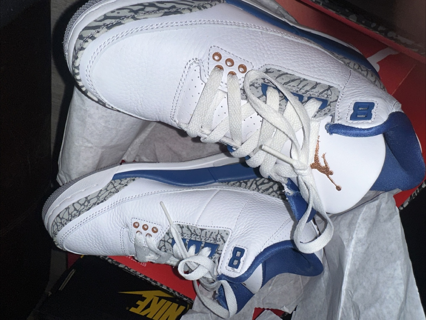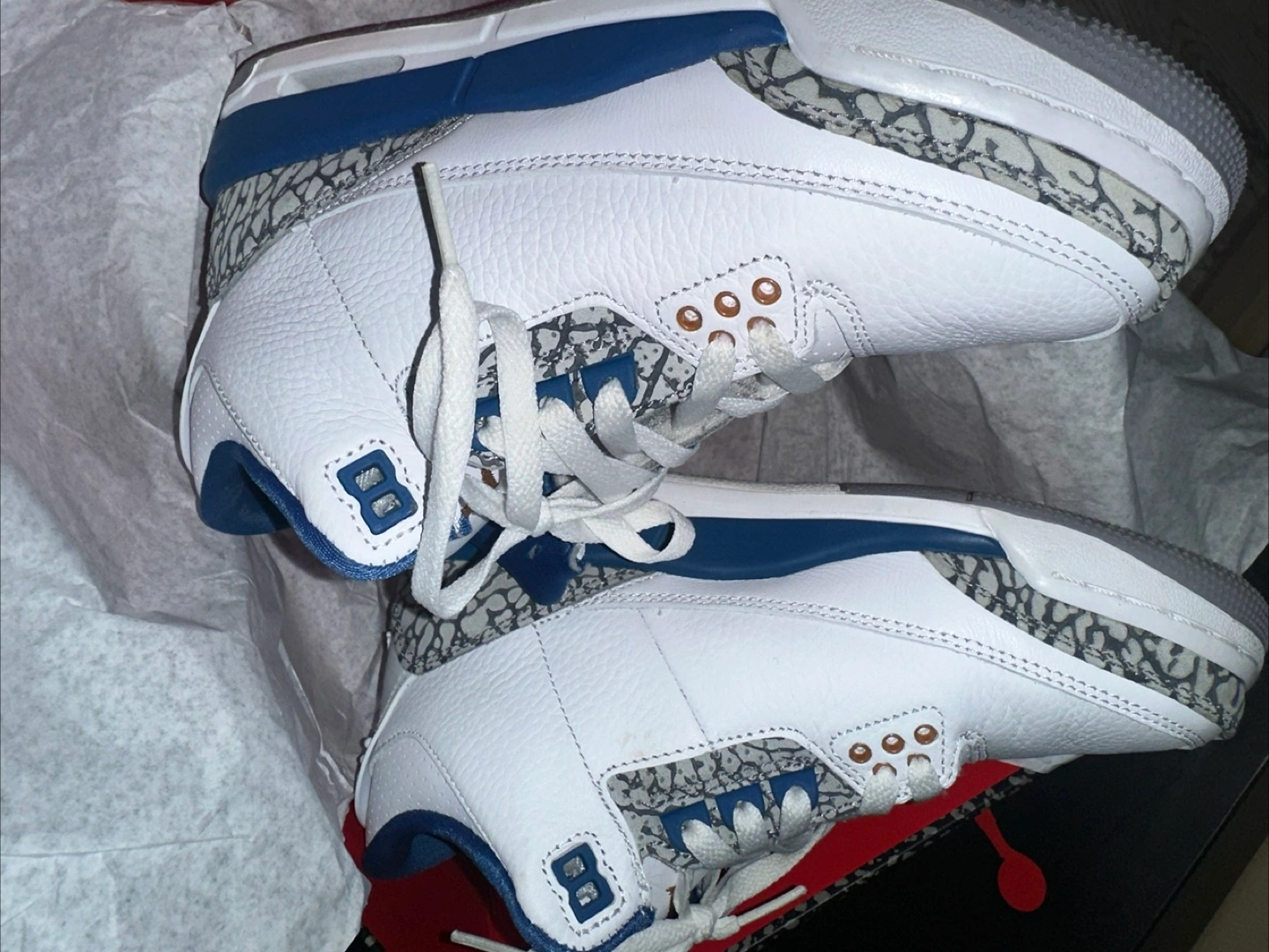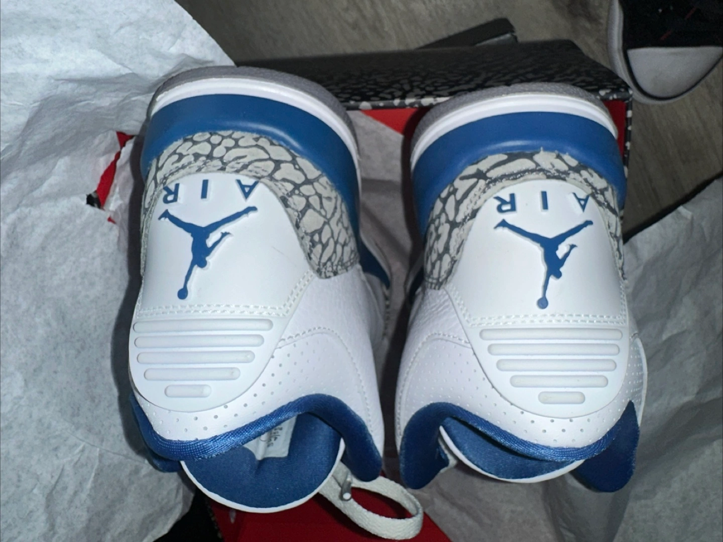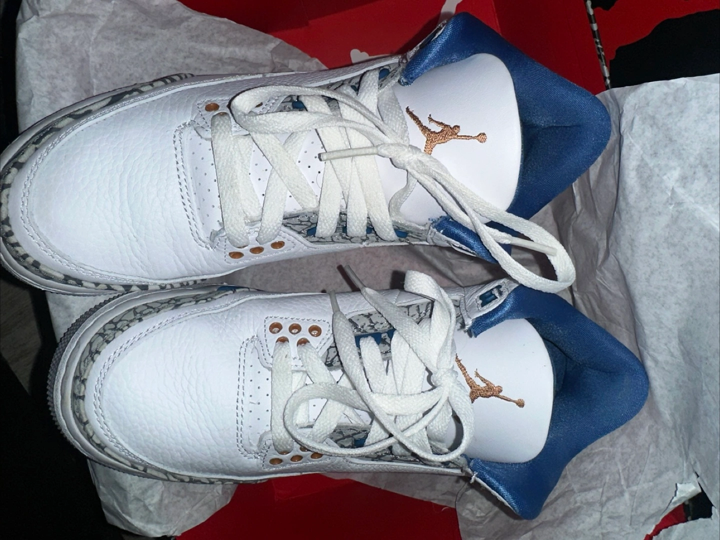 Classic Air Jordan 3 Retro sneakers in white, blue, and grey. Includes original box. Leather and elephant print details.