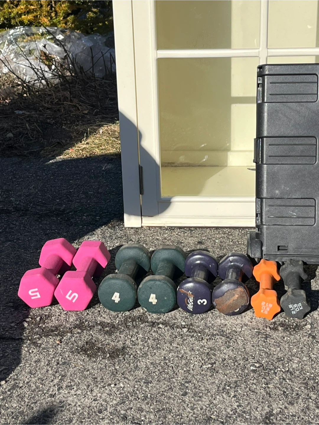 This set includes 8 dumbbells. Weights visible are 5 lbs, 5 lbs, 4 lbs, 4 lbs, 3 lbs, 3 lbs, and two unreadable weights. They're great for home workouts!