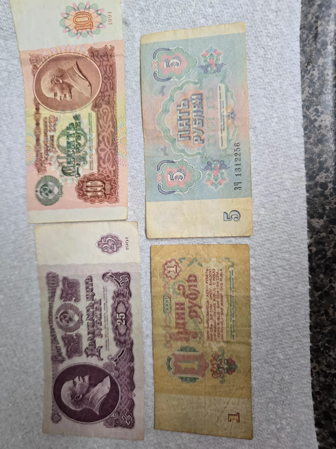 A collection of four Soviet Ruble banknotes, including denominations of 1, 5, 10, and 25 Rubles. Dated 1961, 1991, and featuring portraits of Lenin. These are collectible currency items from the USSR.