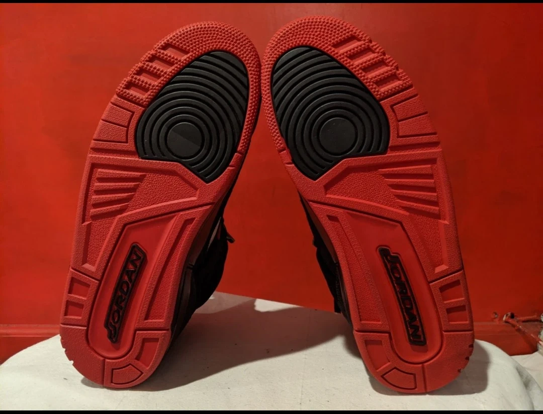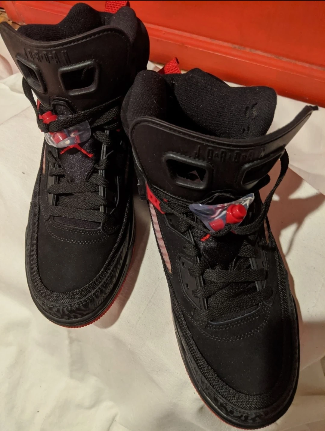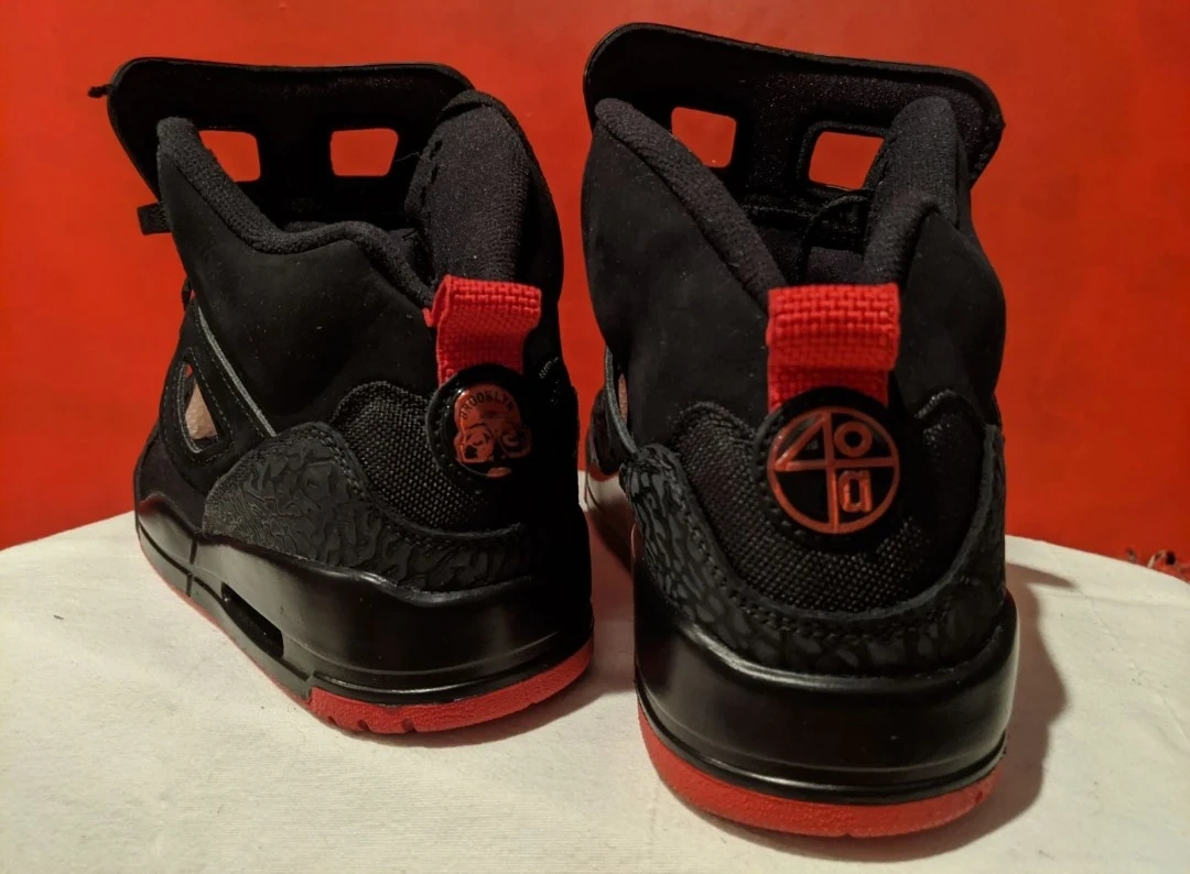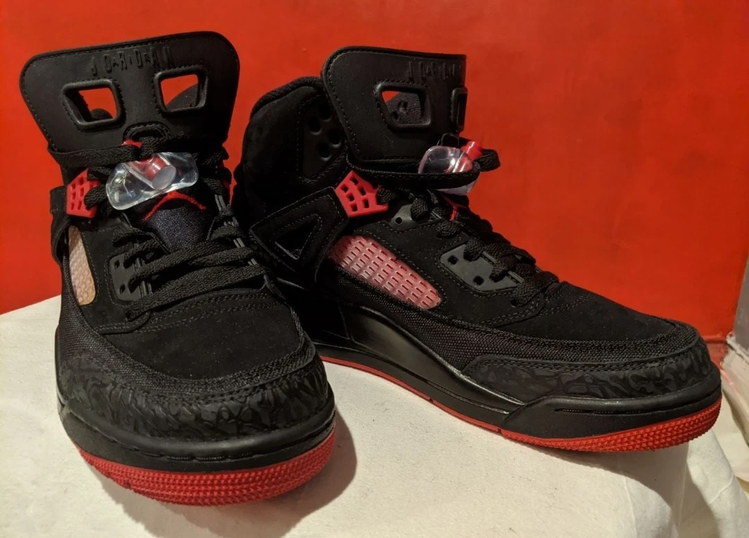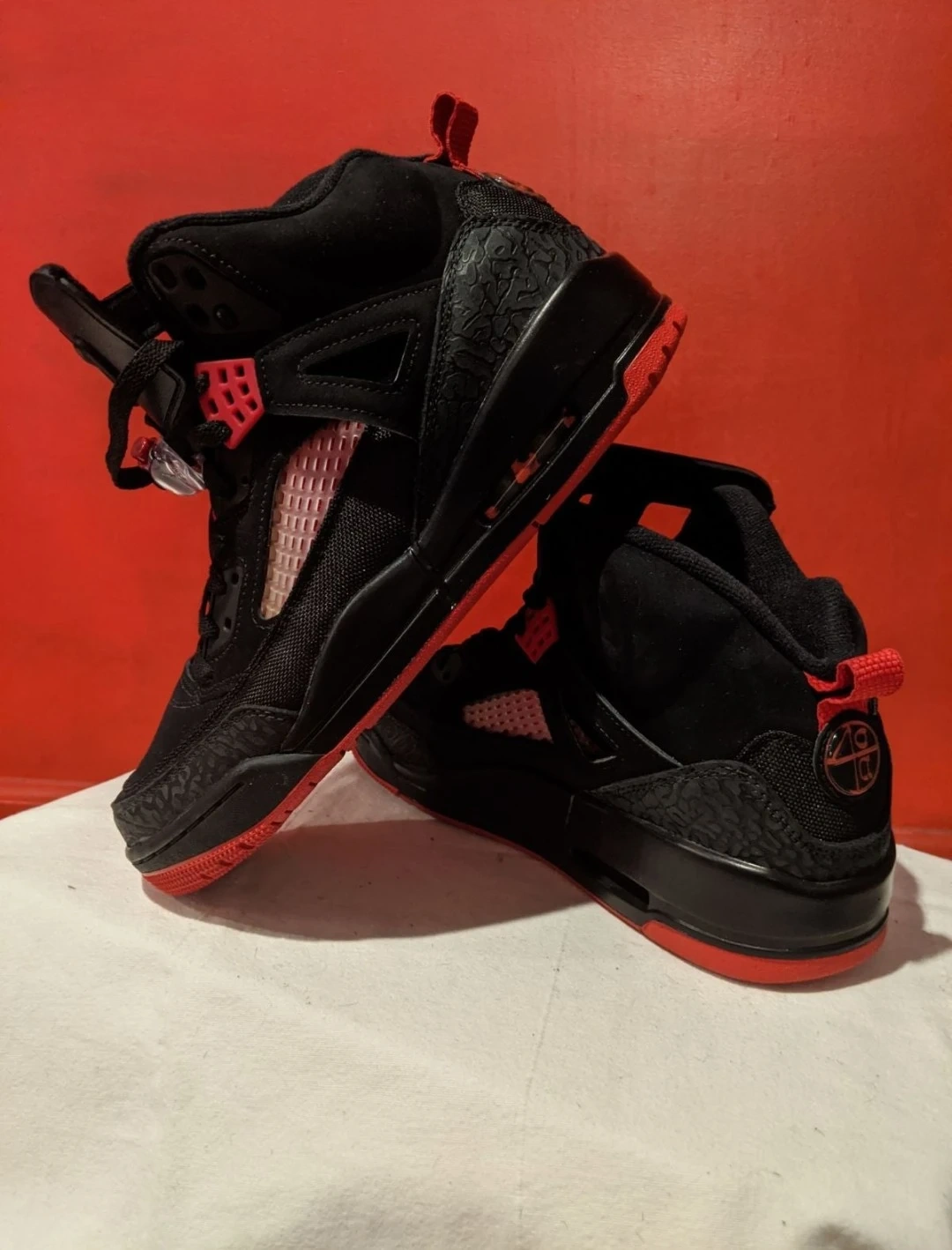Jordan Spizike basketball shoes in black and red. These iconic sneakers feature a high-top design for ankle support. The durable rubber outsole provides excellent traction on the court.