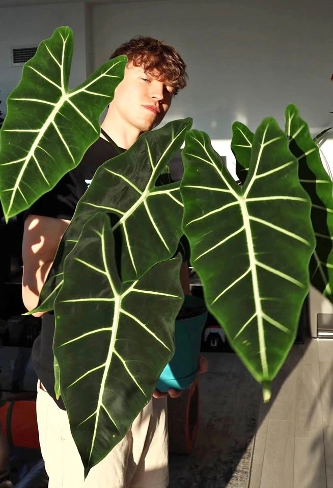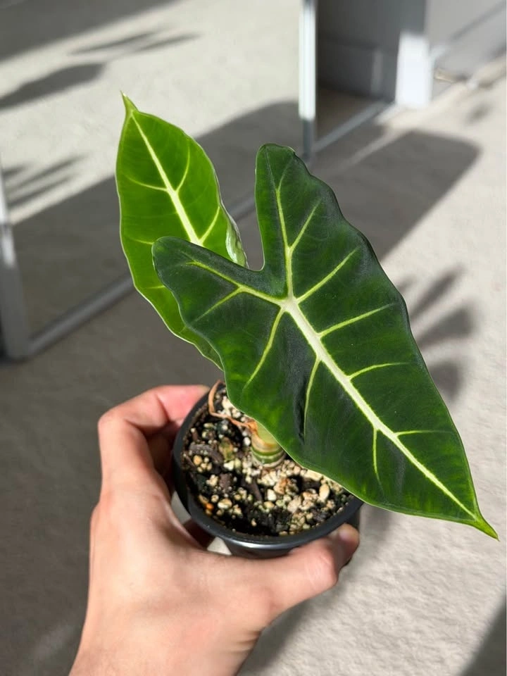 This is one of the easiest Alocasias to care for! It’s well-rooted, healthy, and loves bright, indirect light. Water when the top inch of soil feels dry.