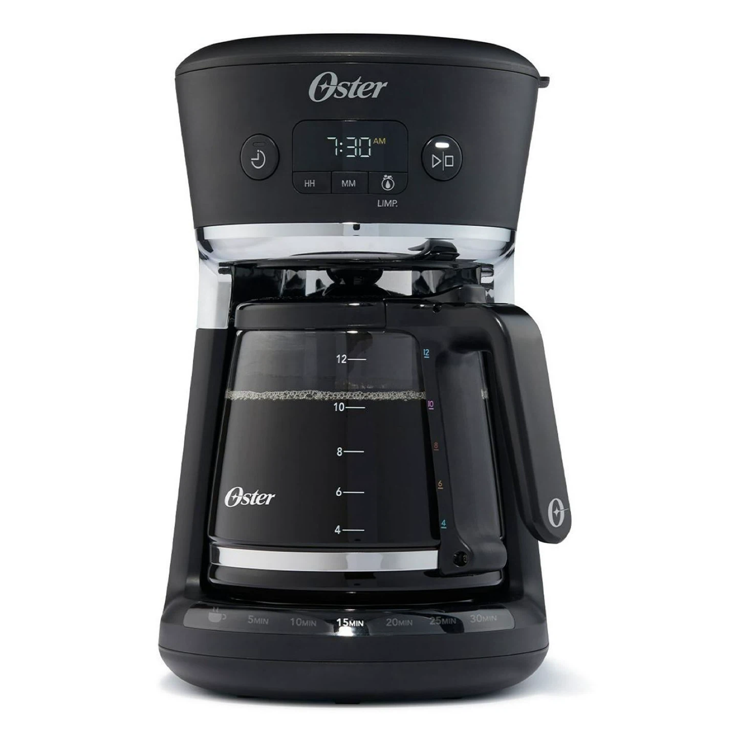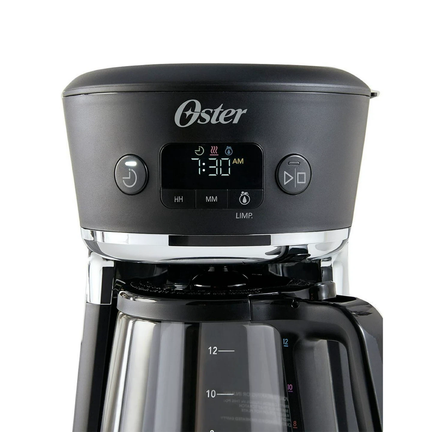 This Oster coffee maker brews up to 12 cups. It features a digital display for easy programming and a glass carafe. Includes a measuring scoop.