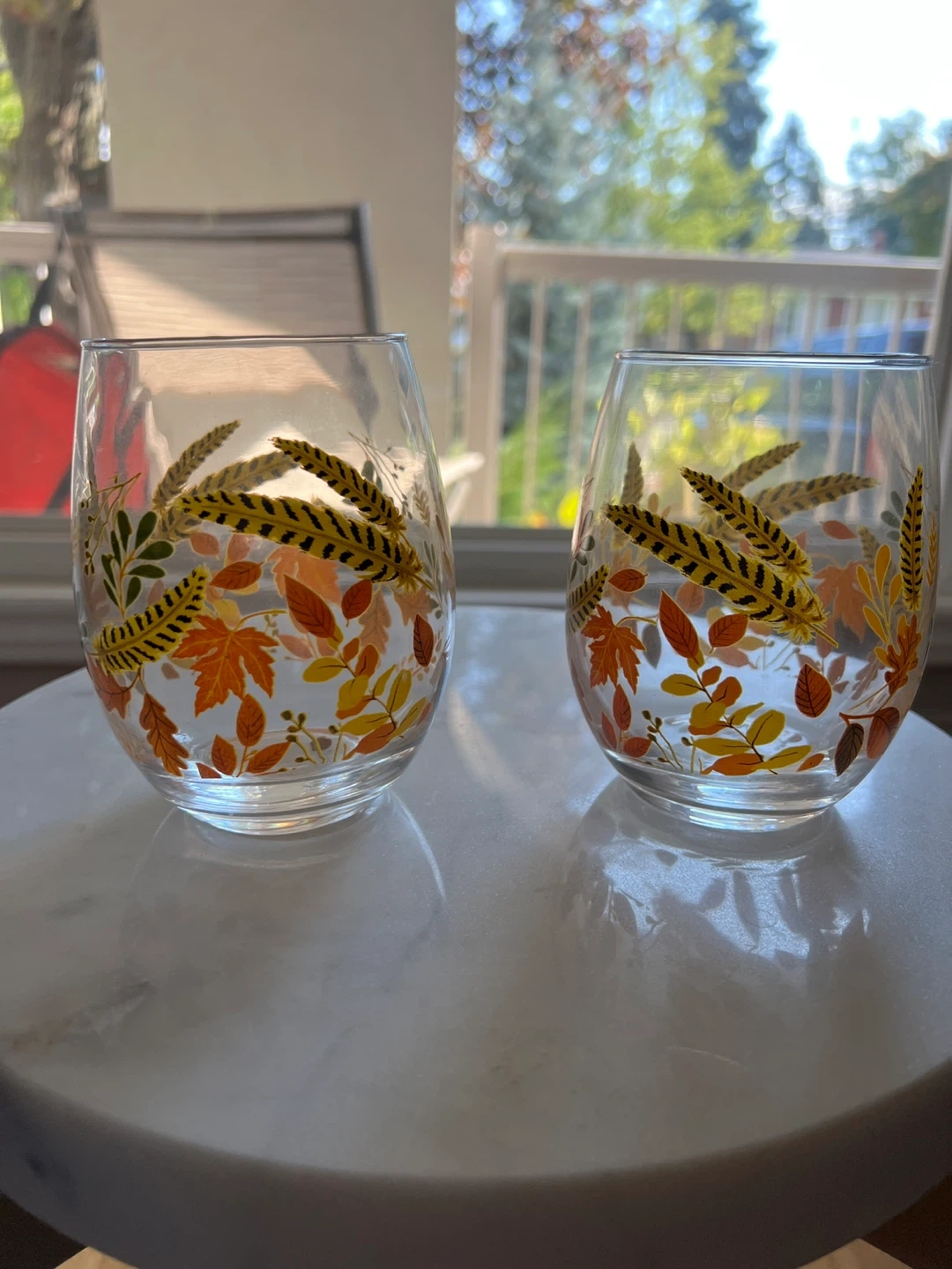 Selling a cute set of two stemless wine glasses, perfect for fall! They feature a lovely autumn leaf and wheat design. Great for everyday use or seasonal decor.