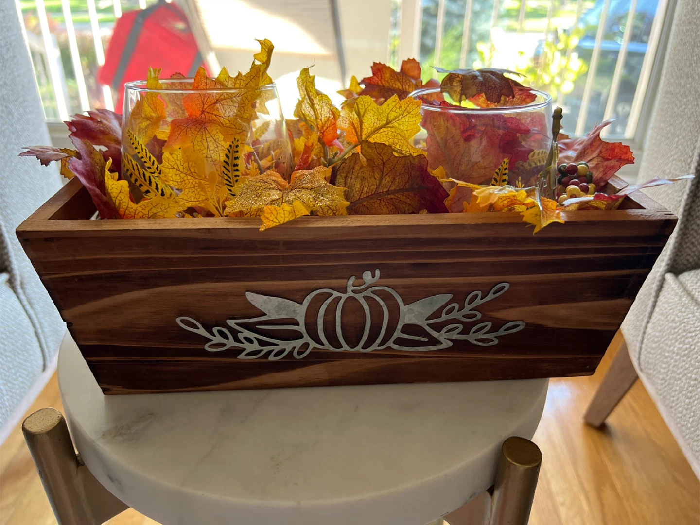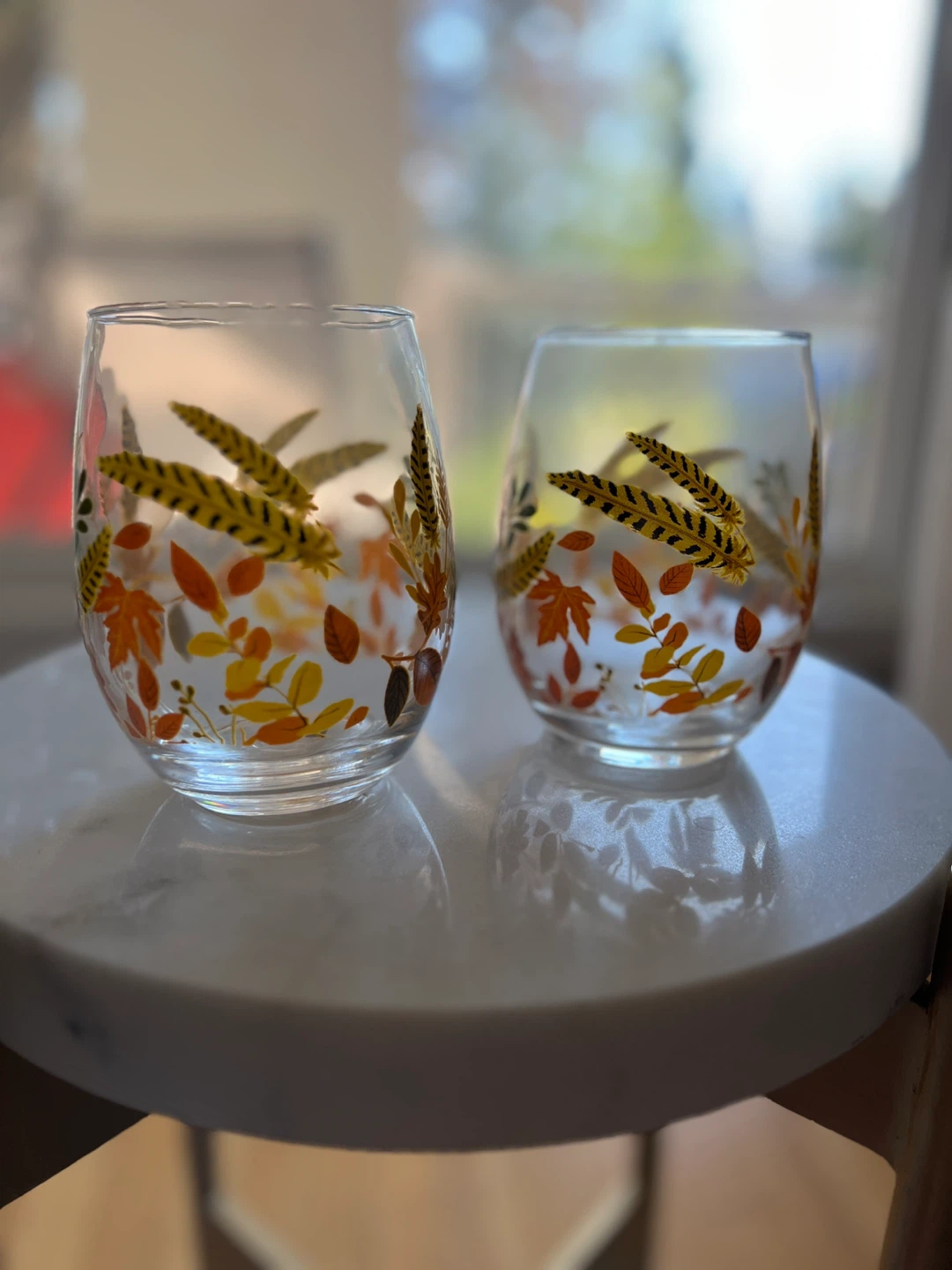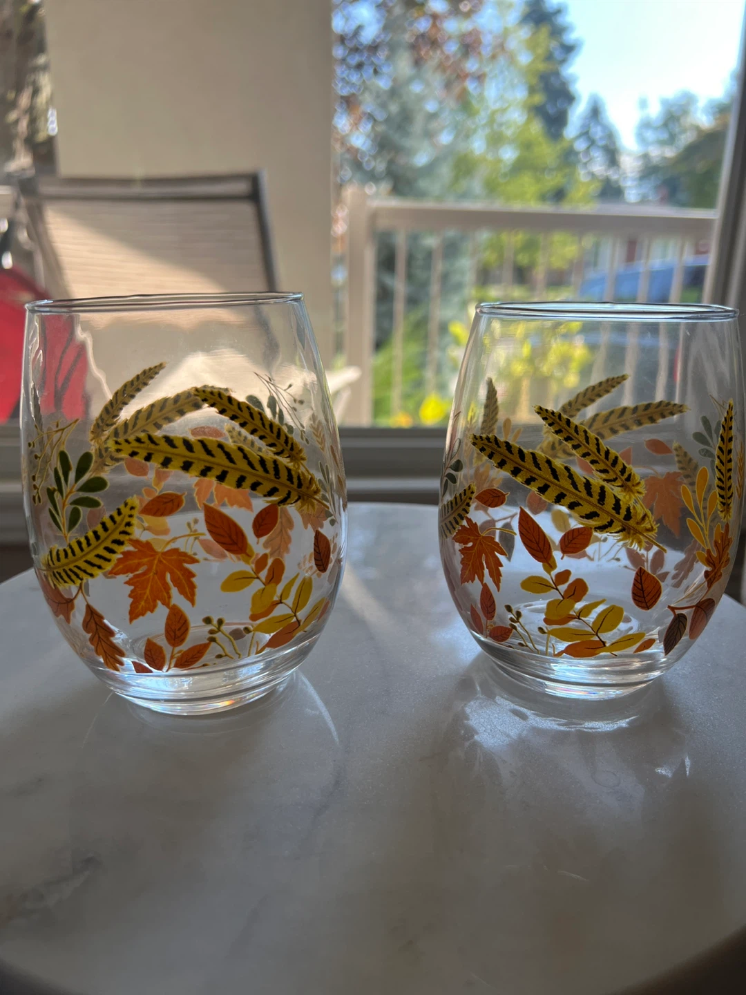Selling a cute set of two stemless wine glasses, perfect for fall! They feature a lovely autumn leaf and wheat design. Great for everyday use or seasonal decor.