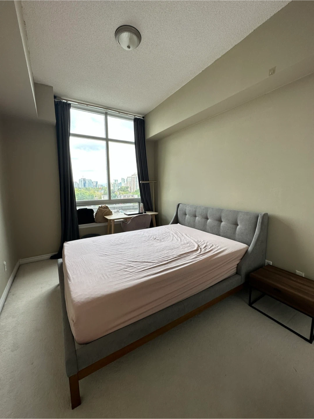 Selling a Structube bed frame with an upholstered headboard. It's in great condition and ready for a new home. The colour is a neutral grey that would match any room. It's a sturdy and stylish bed frame!