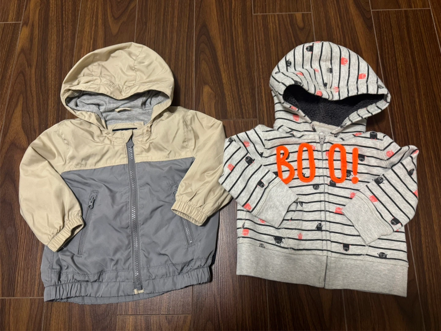 Two kids' hooded jackets for cooler weather. The beige and grey jacket is lightweight with a zip front. The grey hoodie has a 'BOO!' graphic and a fuzzy interior lining. Both are great for layering!