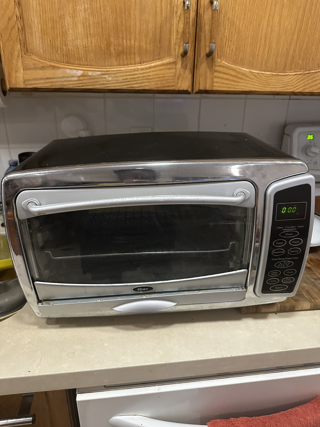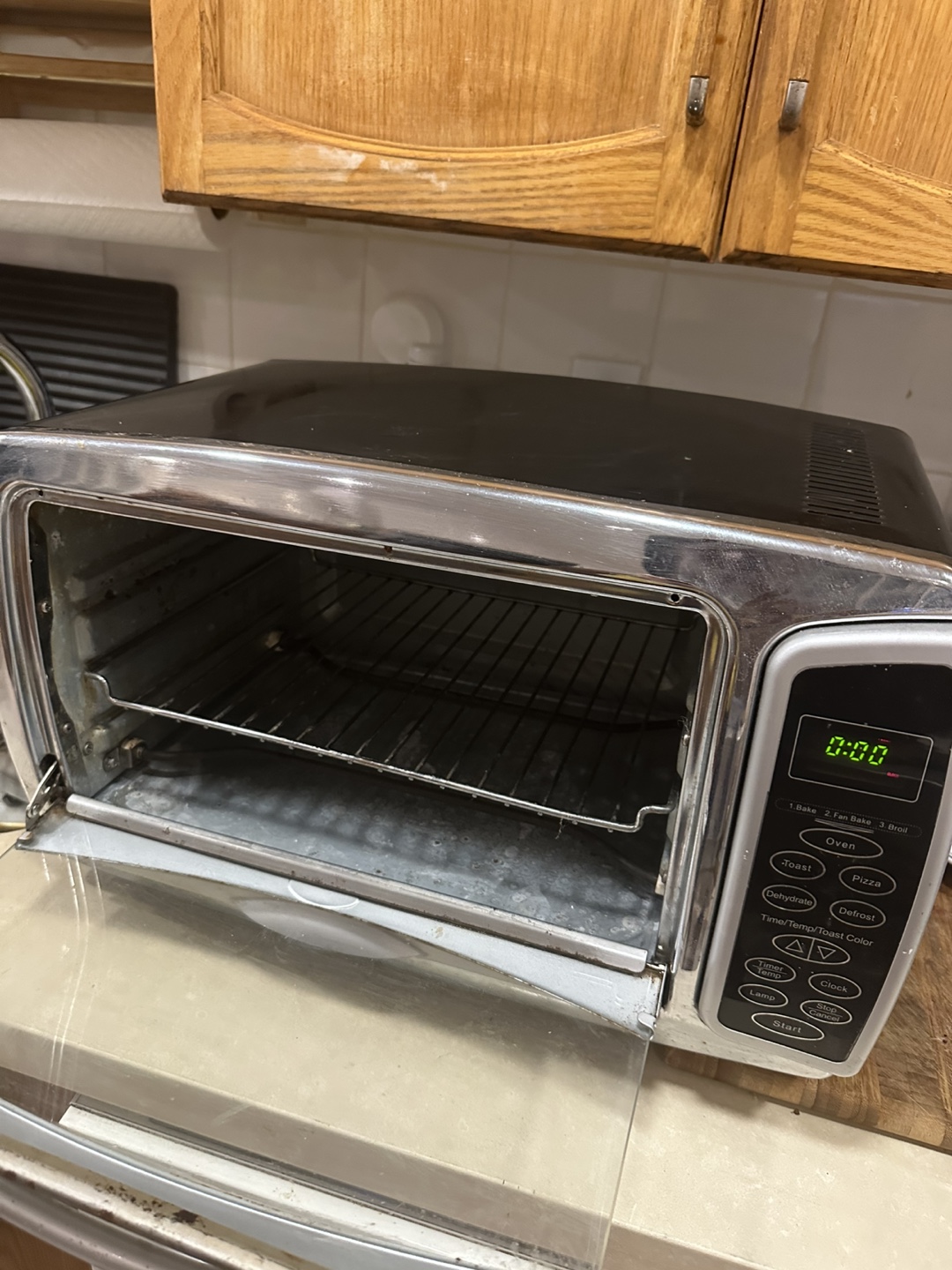 Used Oster toaster oven. Chrome and black finish. Features various cooking functions. Includes baking pan and rack. There are some rusts inside, you need to clean
