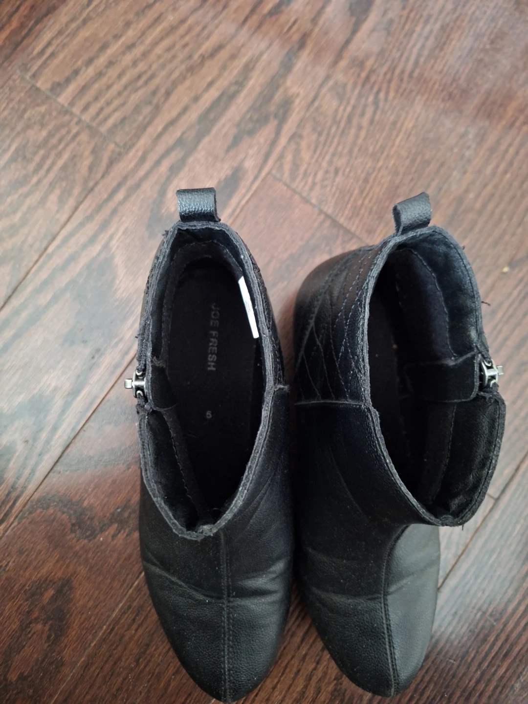 Comfortable black ankle boots from Joe Fresh. They feature a side zipper and quilted detailing on the heel. Easy to slip on and off!
