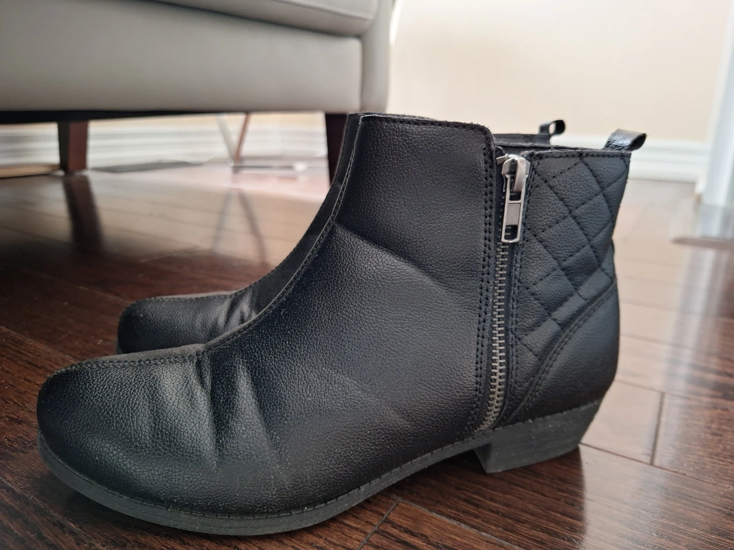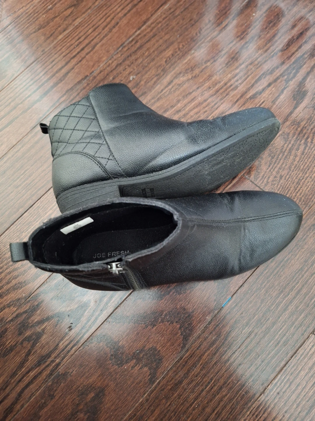 Comfortable black ankle boots from Joe Fresh. They feature a side zipper and quilted detailing on the heel. Easy to slip on and off!