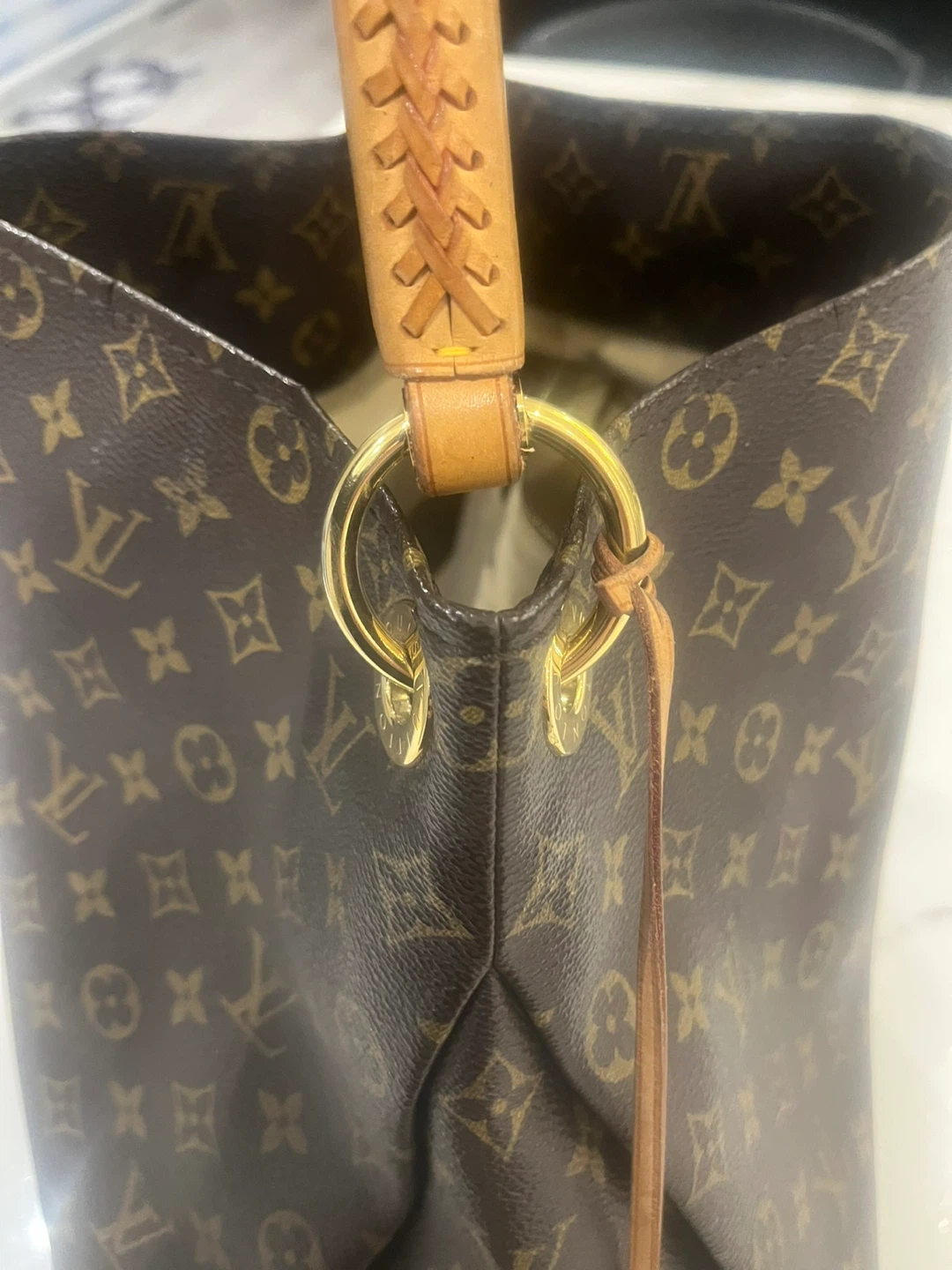 Classic Louis Vuitton shoulder bag in signature monogram canvas. Features braided leather handles and gold-tone hardware. This stylish bag is perfect for everyday use.