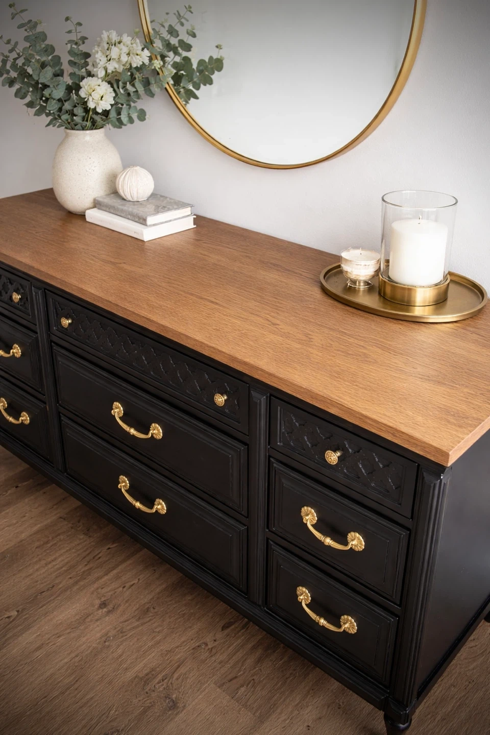 Beautifully refinished solid oak dresser featuring a rich cappuccino-toned wood top and a deep coal black body, finished with elegant brass hardware.
