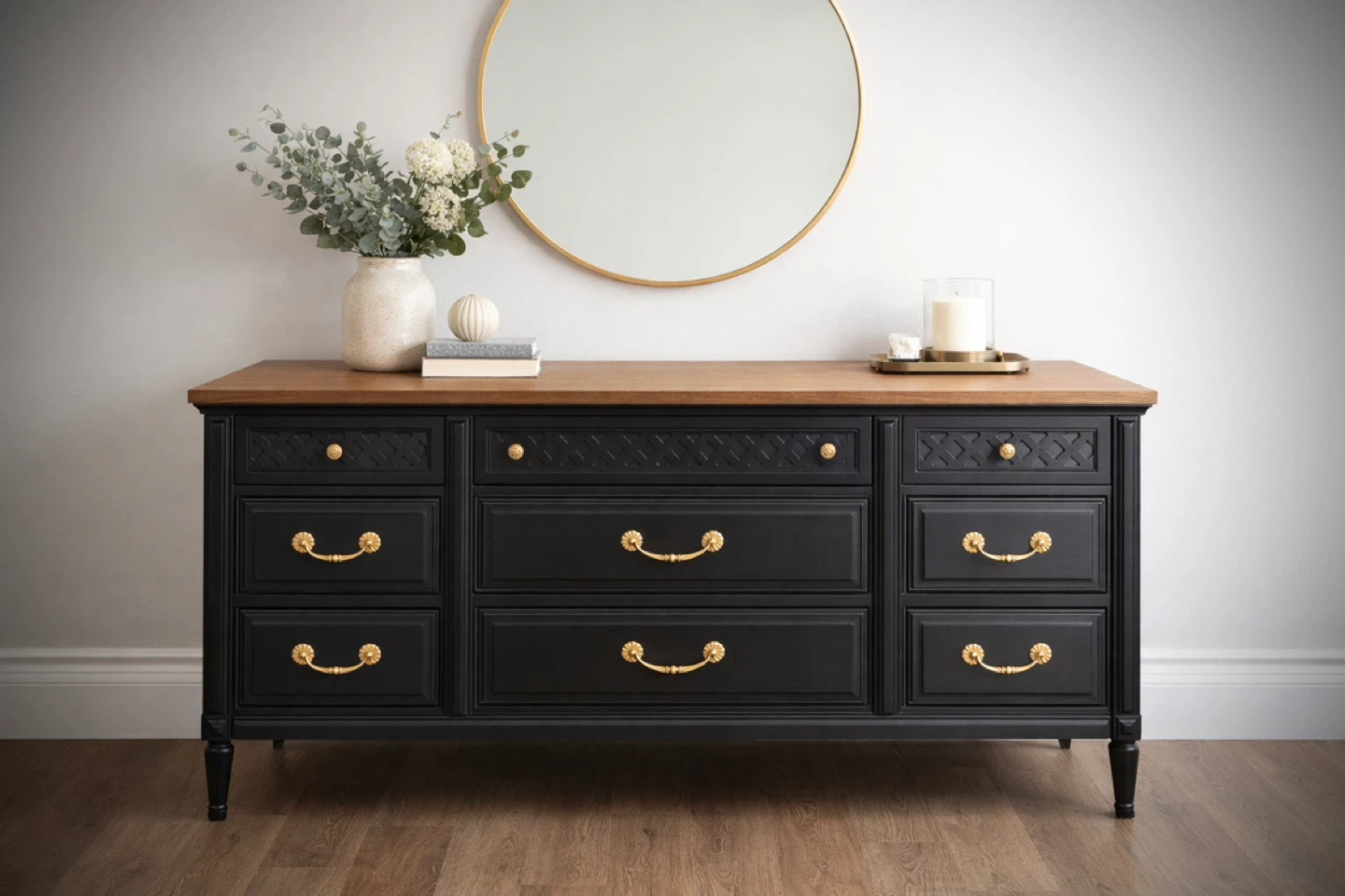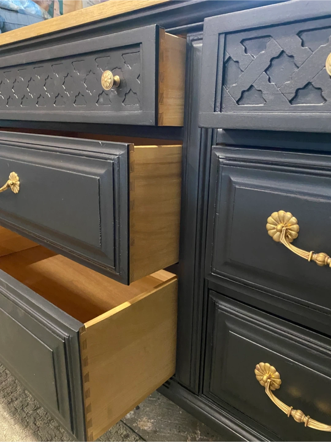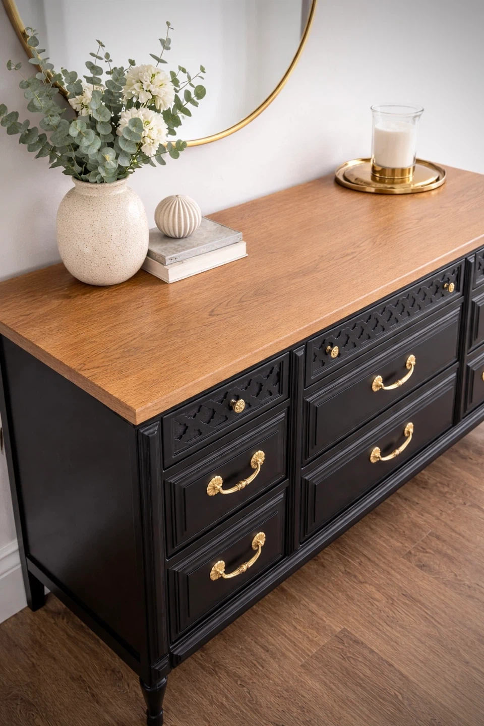 Beautifully refinished solid oak dresser featuring a rich cappuccino-toned wood top and a deep coal black body, finished with elegant brass hardware.