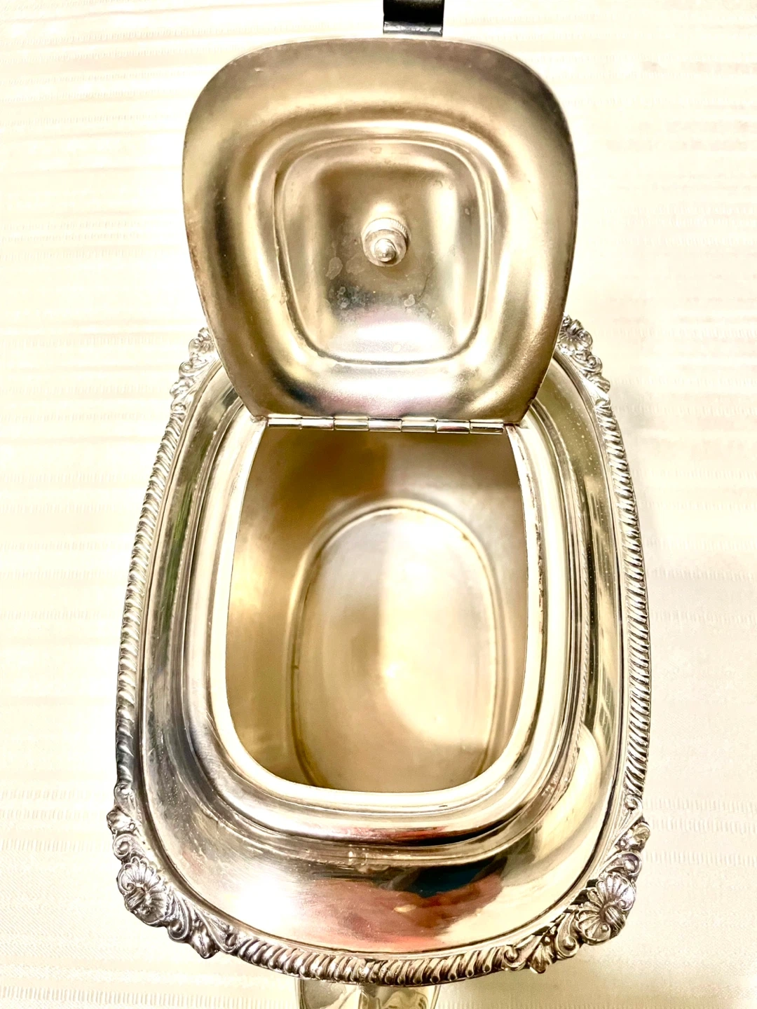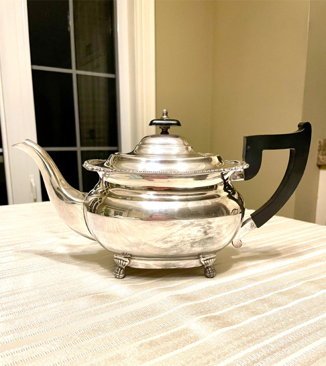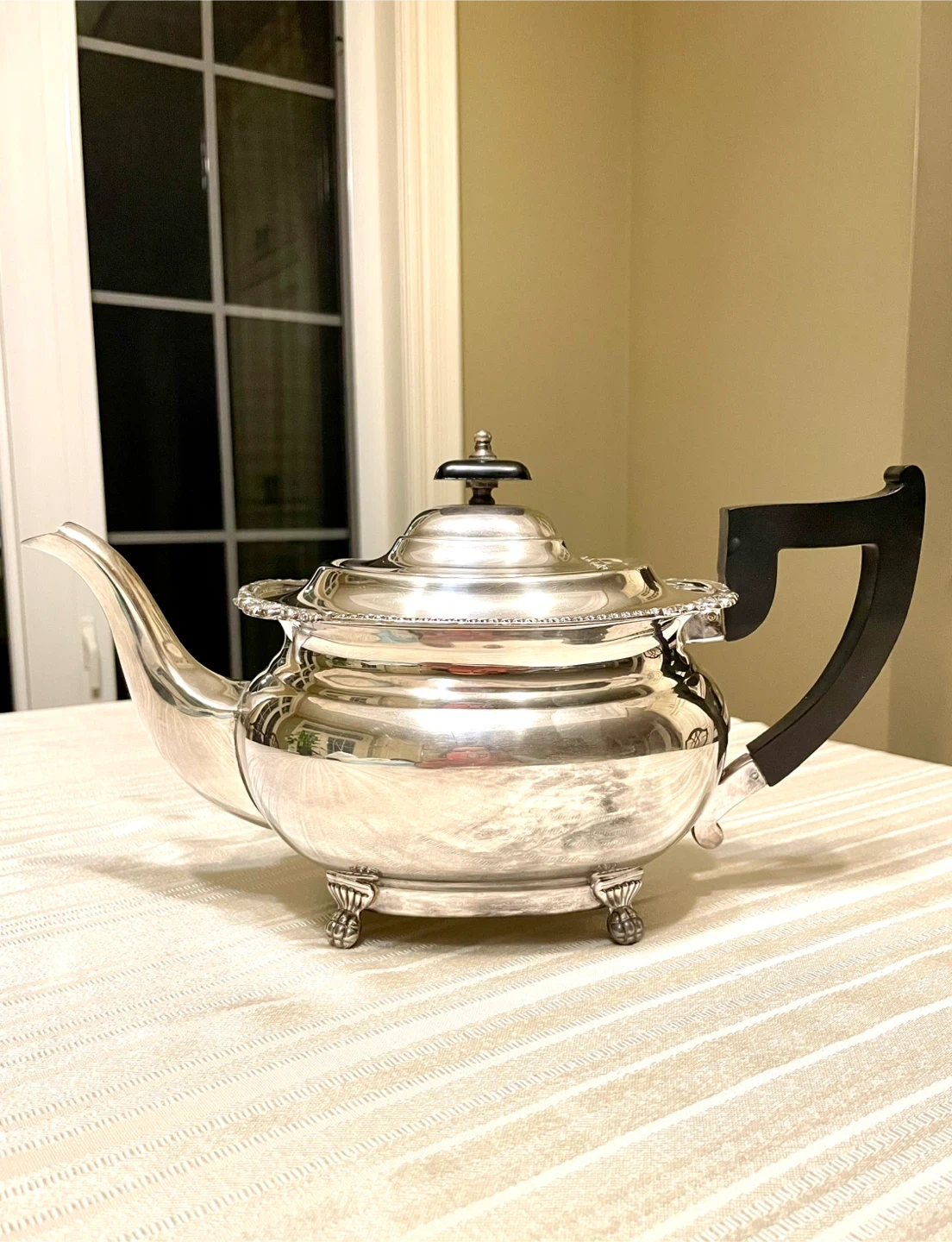 Selling a stunning Viners of Sheffield antique footed silverplated teapot with a scrolled handle made in England.