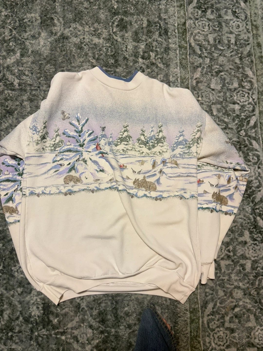 This Artisans Design crewneck sweatshirt features a charming winter scene with woodland creatures and snow-covered trees. It's a size L-XL. The material is likely a cotton blend, offering comfort for cooler days.