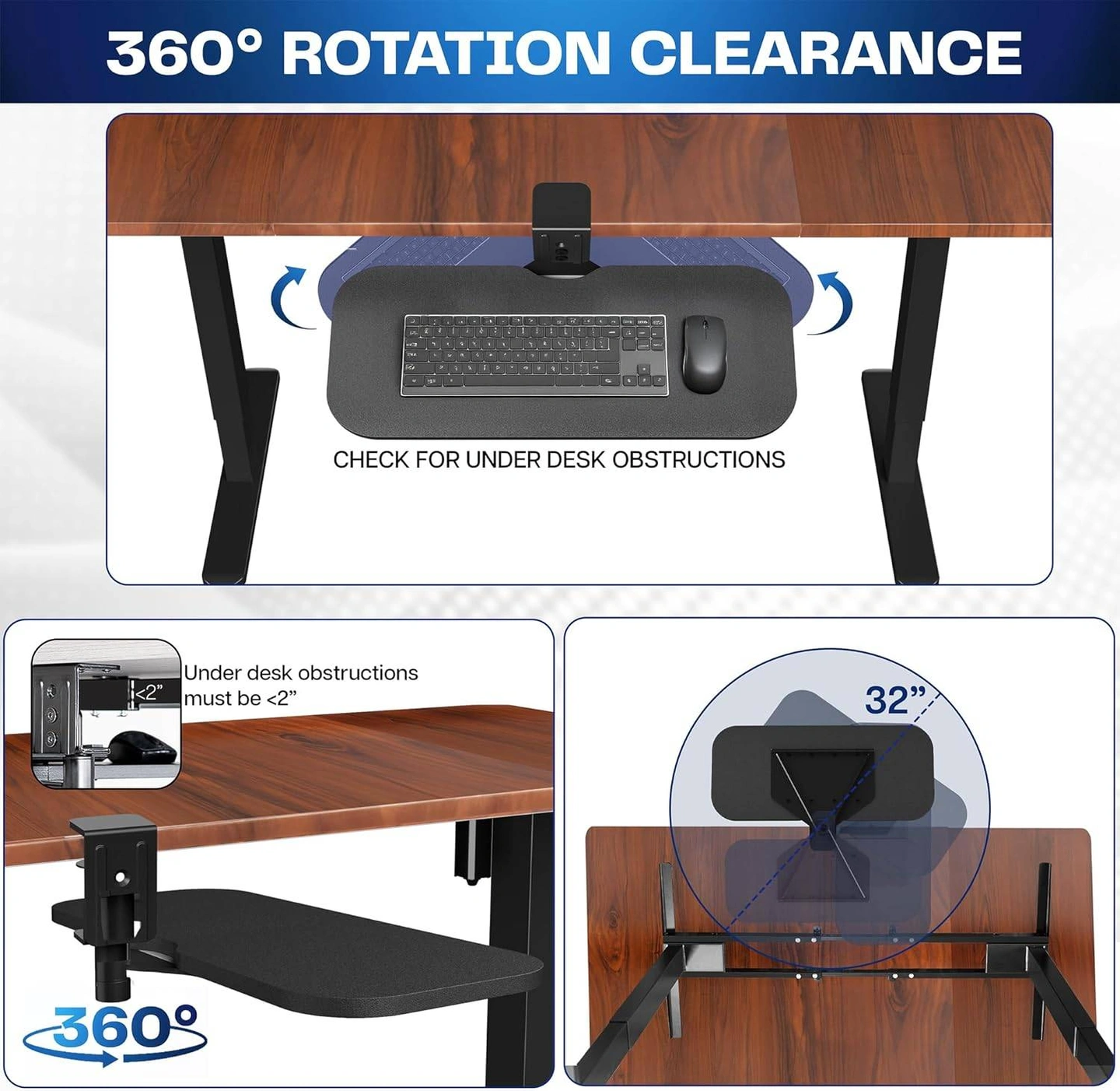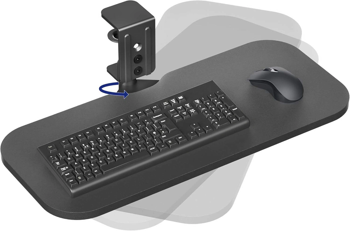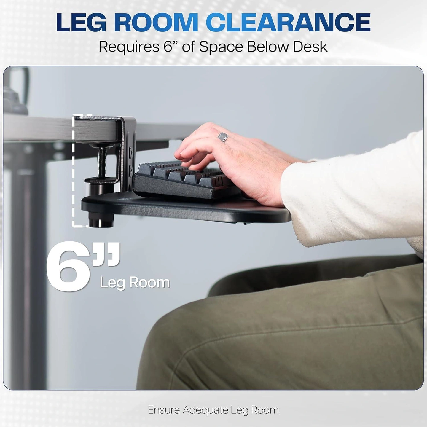 This VIVO under desk keyboard tray is a great way to add some extra space to your workstation! It's black and measures 22.8" in width and 9.8" in depth. The tray also has 4" of keyboard clearance and requires 6" of space below the desk for leg room. It fits side by side keyboard and mouse, and easily rotates out of the way for storage