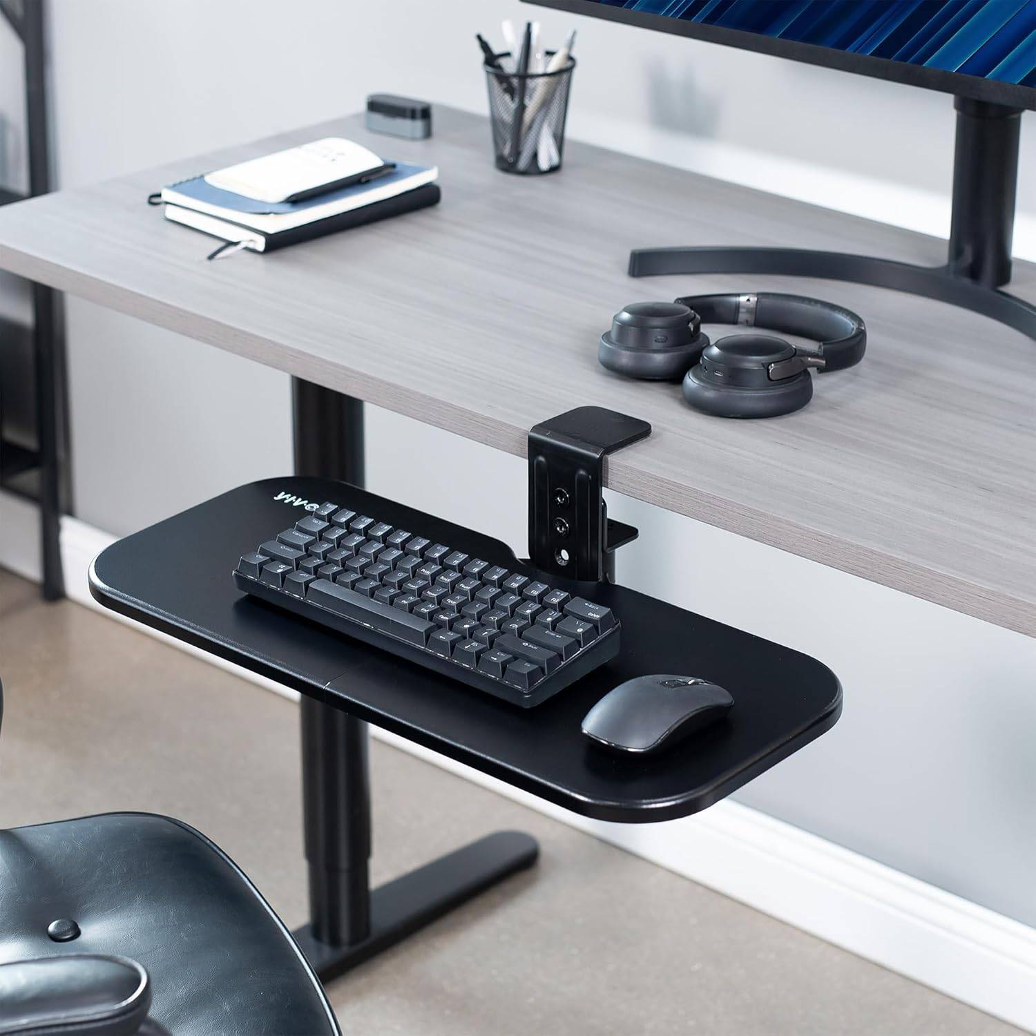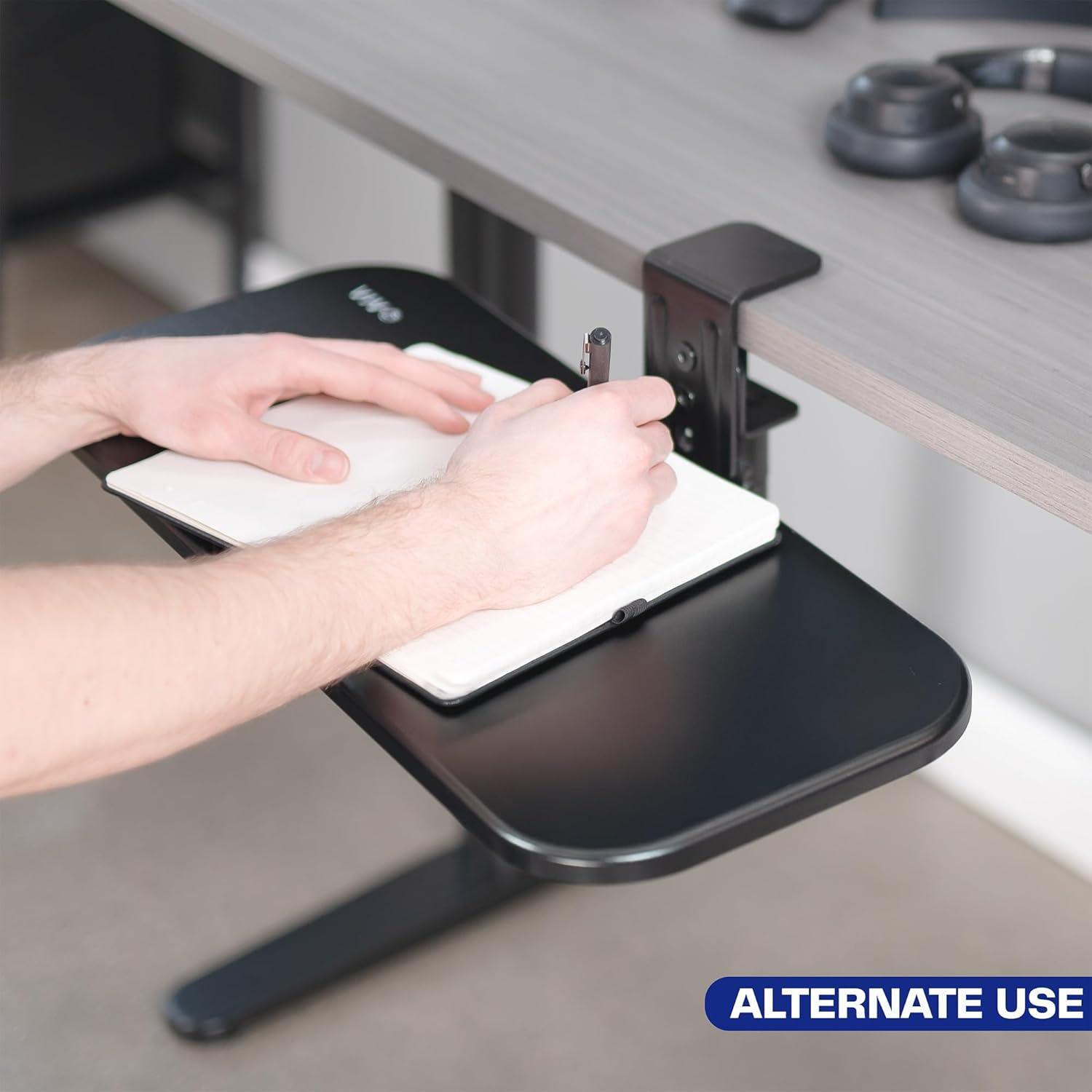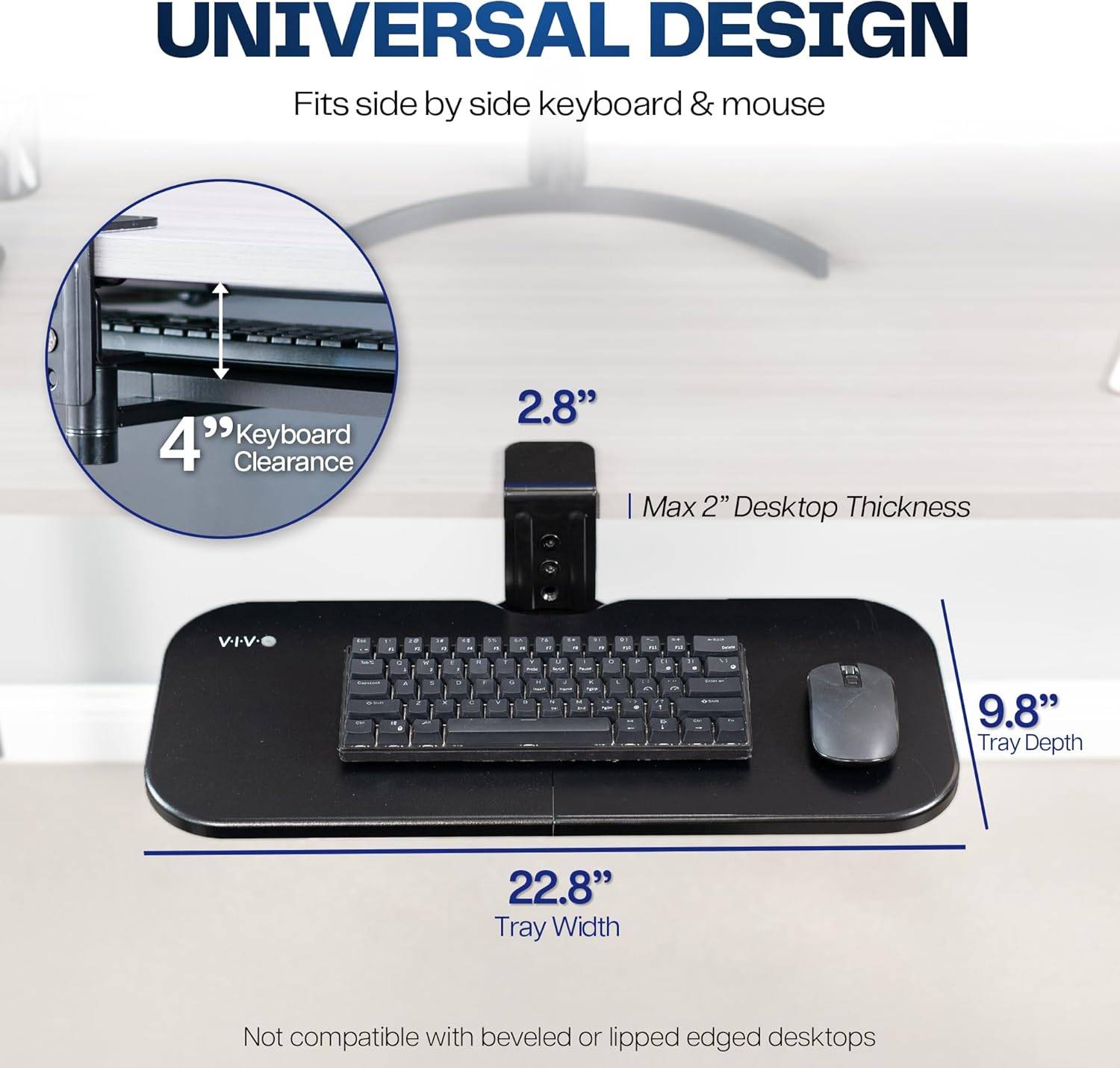 This VIVO under desk keyboard tray is a great way to add some extra space to your workstation! It's black and measures 22.8" in width and 9.8" in depth. The tray also has 4" of keyboard clearance and requires 6" of space below the desk for leg room. It fits side by side keyboard and mouse, and easily rotates out of the way for storage