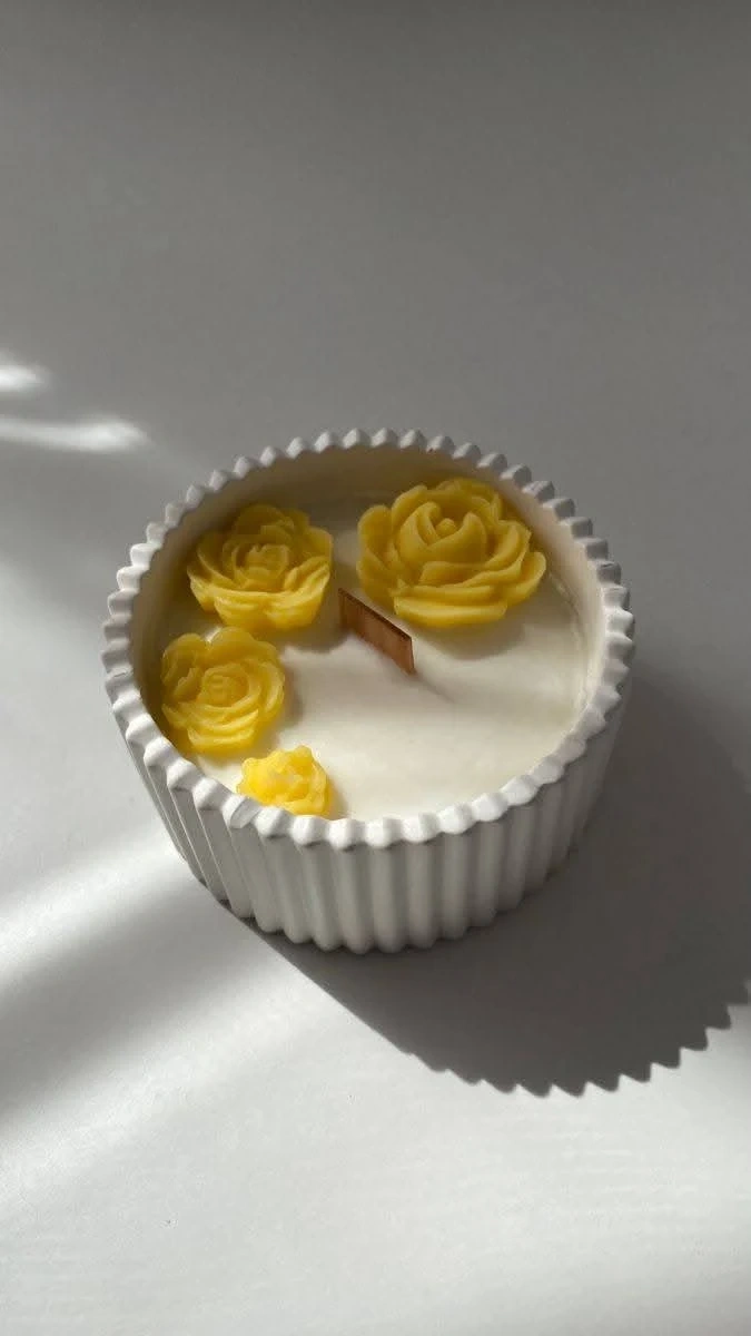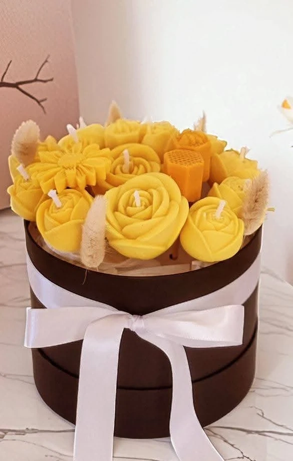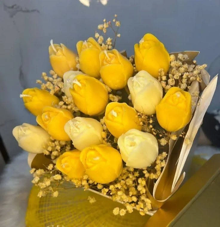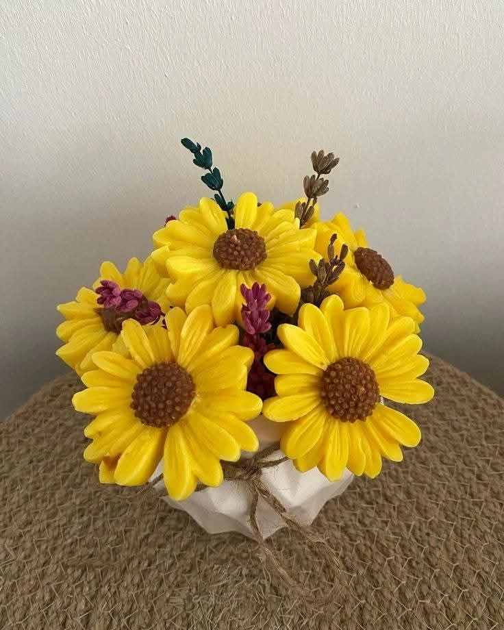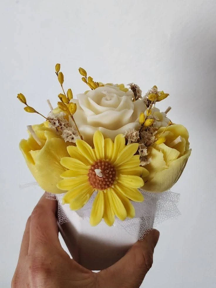 This is a charming bouquet of handmade scented candles designed to look like flowers. It's a lovely decorative piece for any room. Crafted from wax, it adds a warm glow when lit.