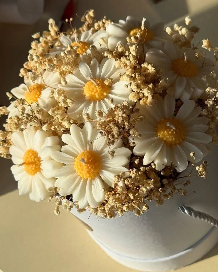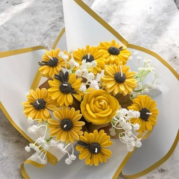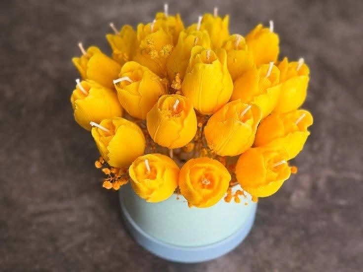 This is a charming bouquet of handmade scented candles designed to look like flowers. It's a lovely decorative piece for any room. Crafted from wax, it adds a warm glow when lit.