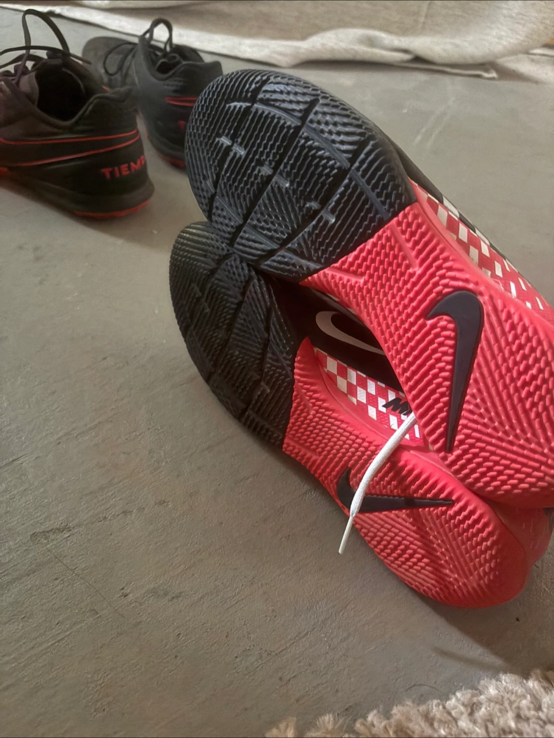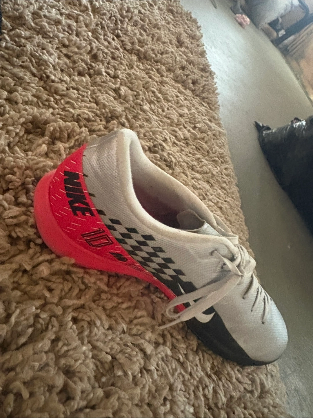 Selling a pair of indoor Nike Mercurial shoes! They have a cool checkered design and a red heel with the Nike logo on the side. Great for playing soccer or just kicking around! Never worn