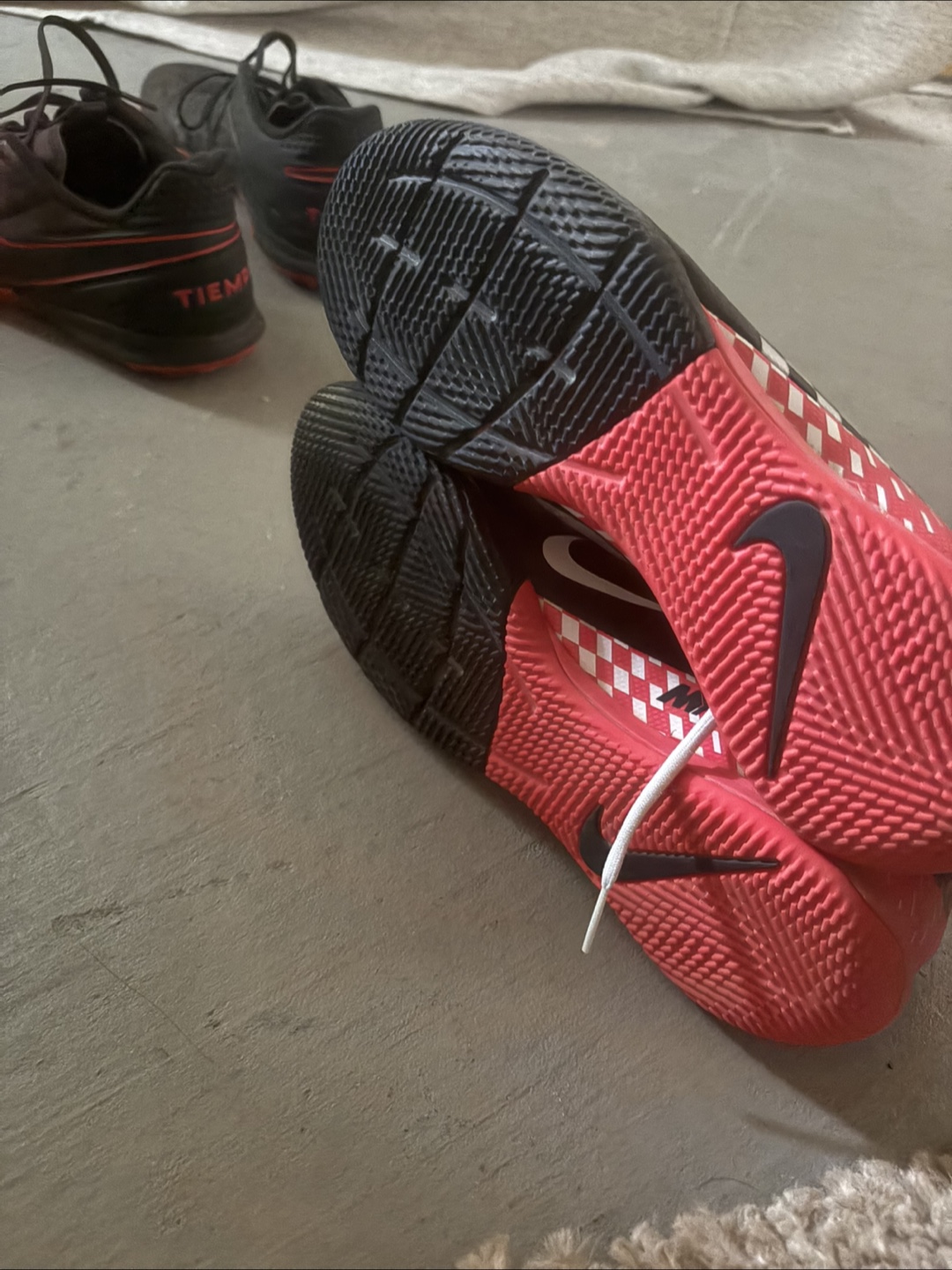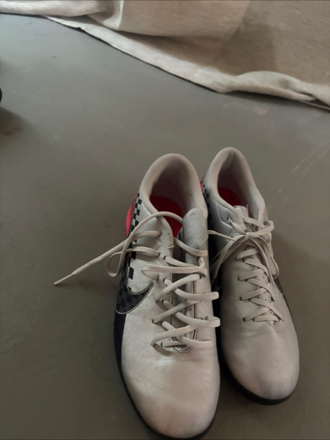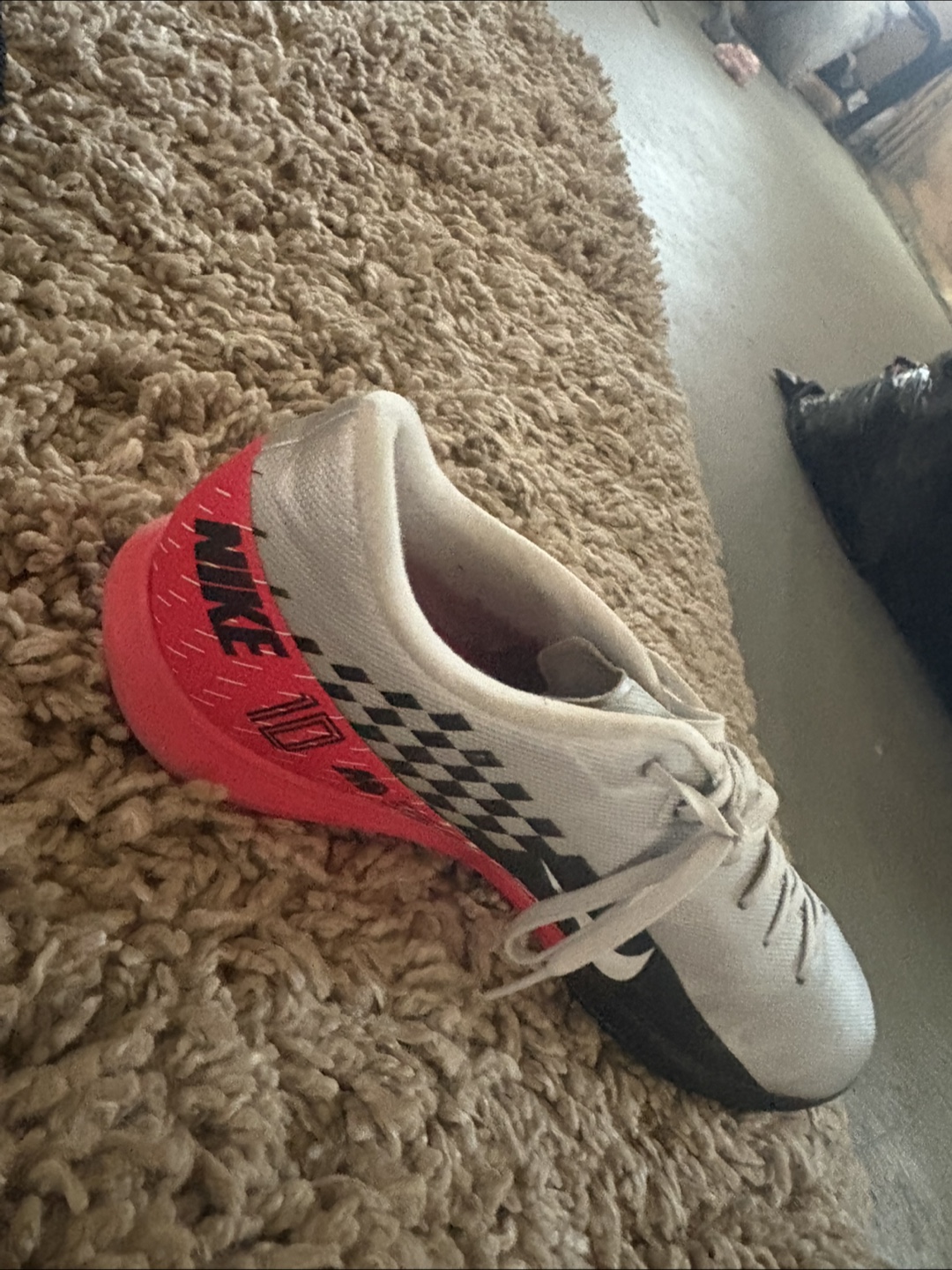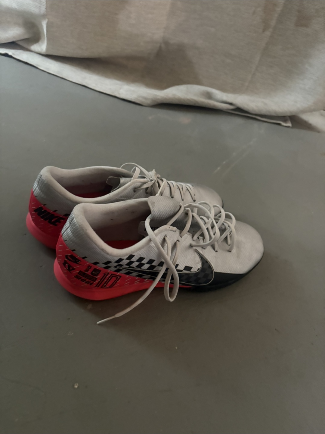 Selling a pair of indoor Nike Mercurial shoes! They have a cool checkered design and a red heel with the Nike logo on the side. Great for playing soccer or just kicking around! Never worn