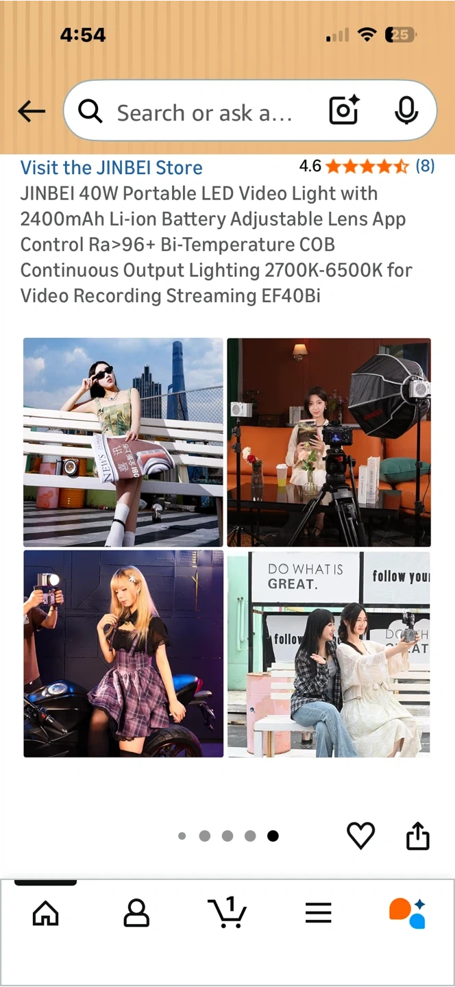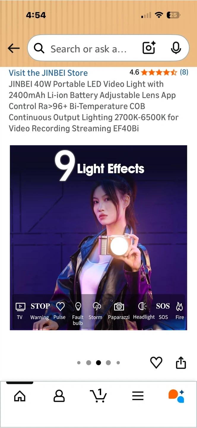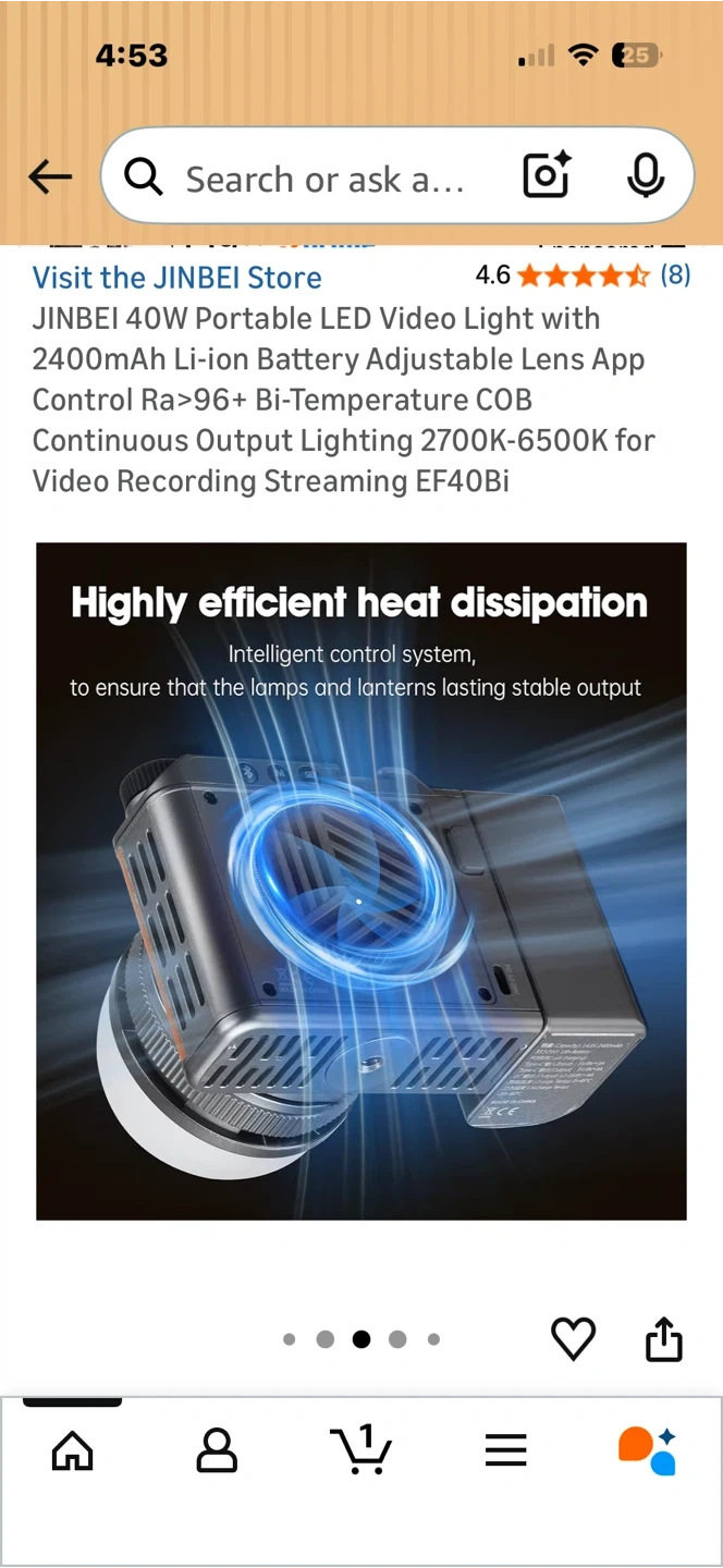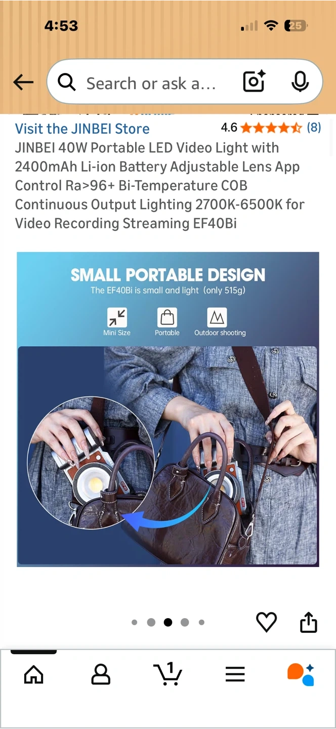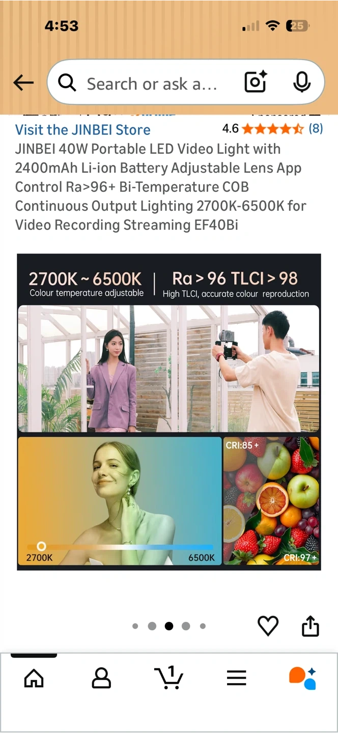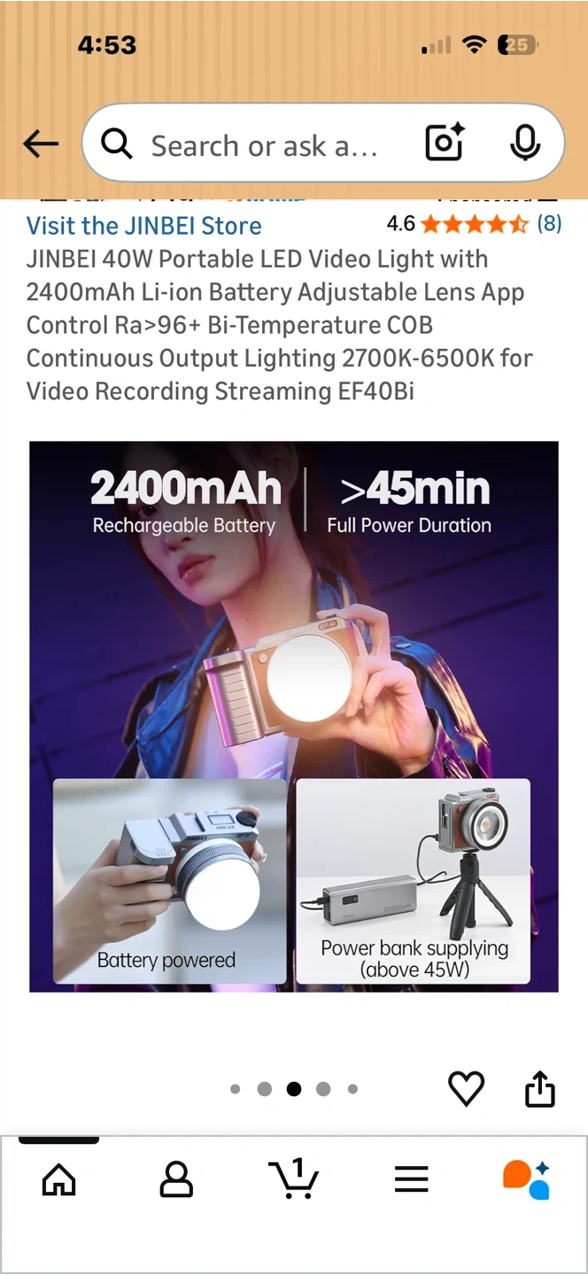 This JINBEI LED video light is portable and offers adjustable colour temperature from 2700K-6500K. It has a 2400mAh rechargeable battery with over 45 minutes of full power duration. The light also features app control and high CRI for accurate colour reproduction. It's small and light, weighing only 515g.