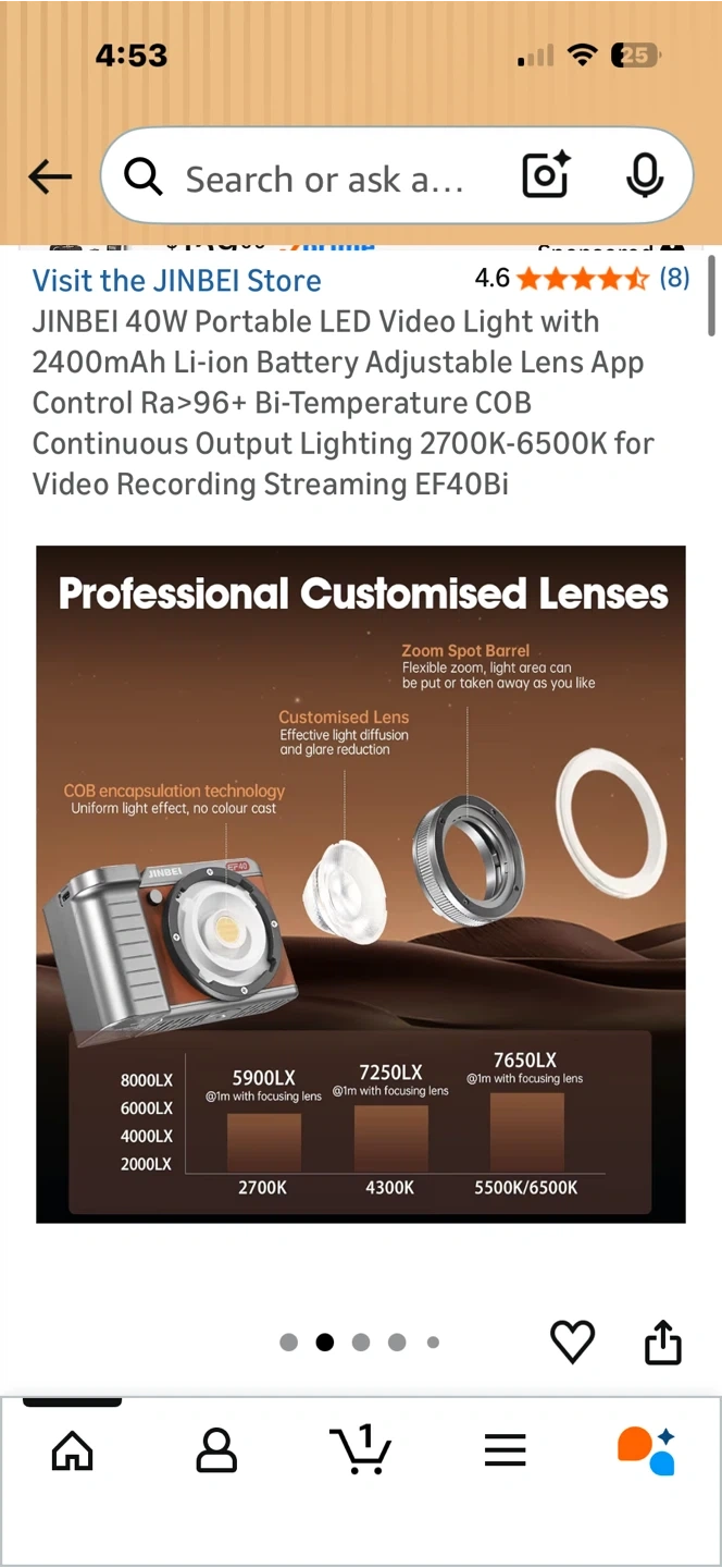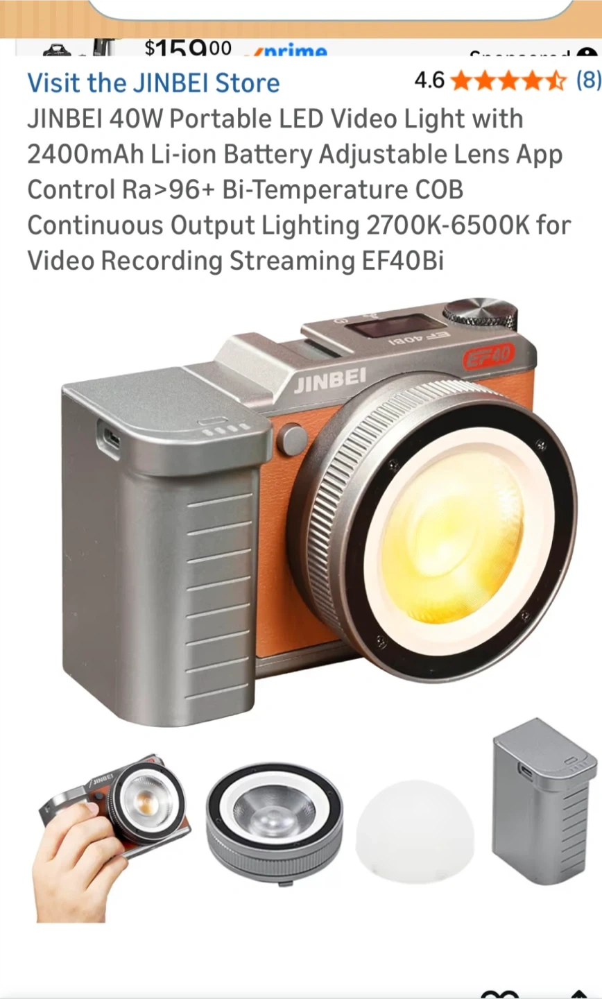 This JINBEI LED video light is portable and offers adjustable colour temperature from 2700K-6500K. It has a 2400mAh rechargeable battery with over 45 minutes of full power duration. The light also features app control and high CRI for accurate colour reproduction. It's small and light, weighing only 515g.