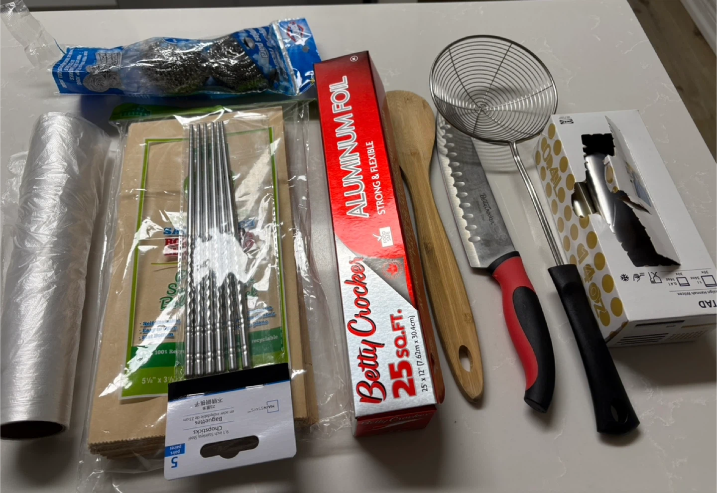 Includes a pair of oven mitts with a floral design, a matching pot holder, a pink vegetable peeler, and a metal pot stand. Also includes a set of five metal chopsticks and a wooden spoon. A Betty Crocker aluminum foil roll is also part of the set. Various kitchen tools and accessories are bundled together for your cooking needs!