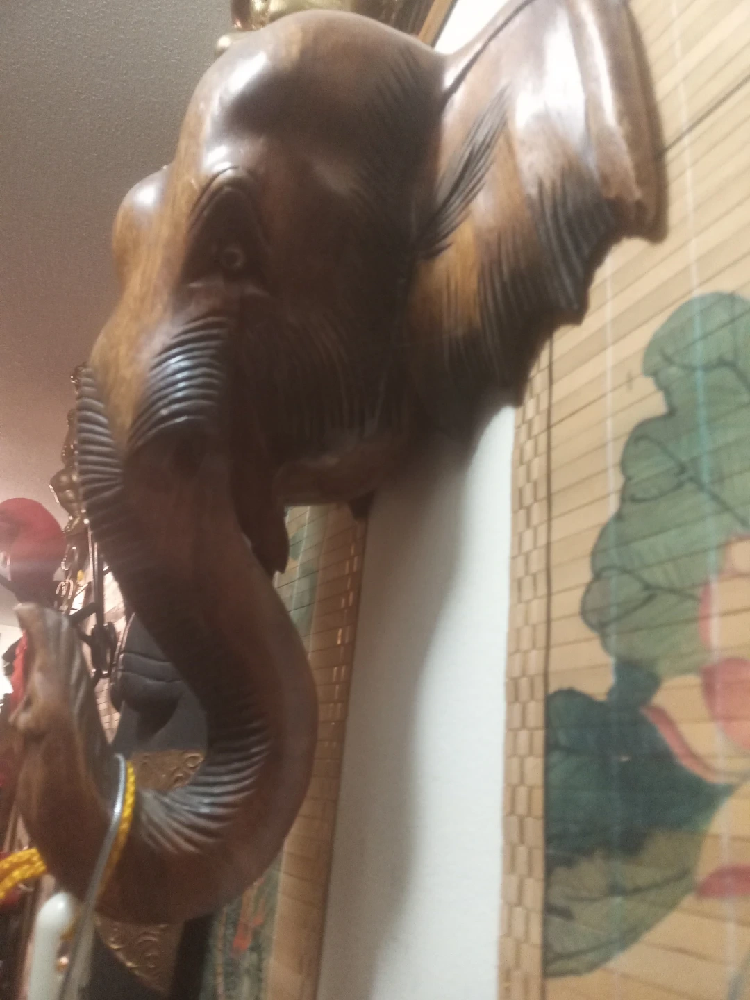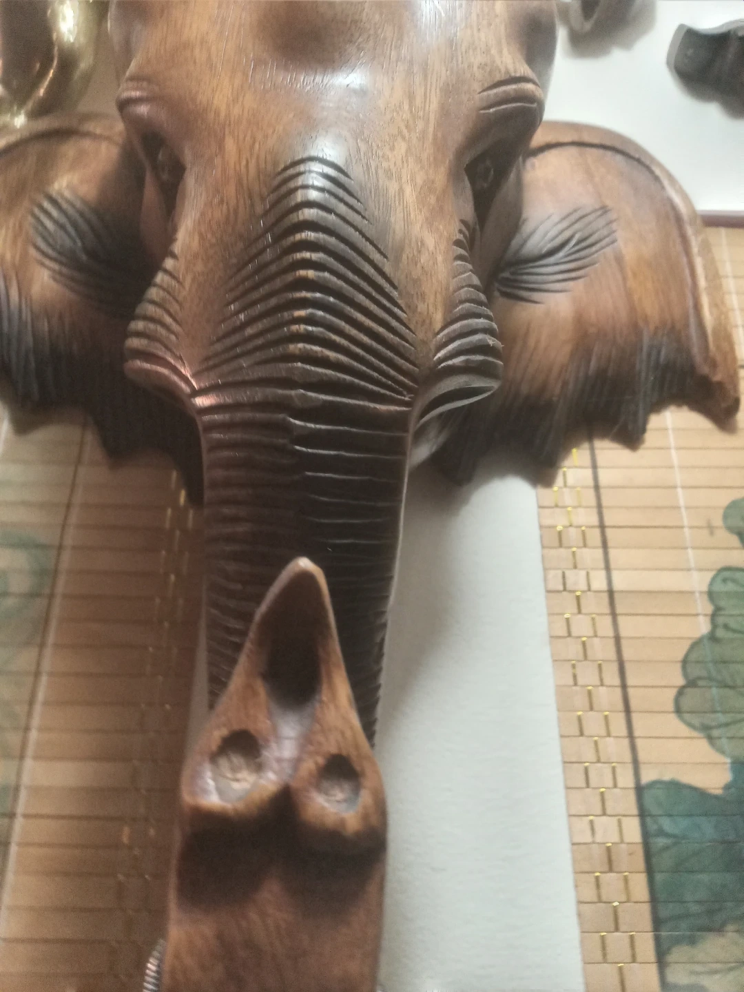 This is a carved wooden elephant head, perfect for adding a unique touch to your home decor. It's made of solid wood with intricate details on the trunk and ears. Mount it on your wall to create a statement piece!
