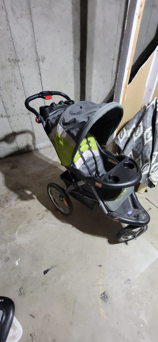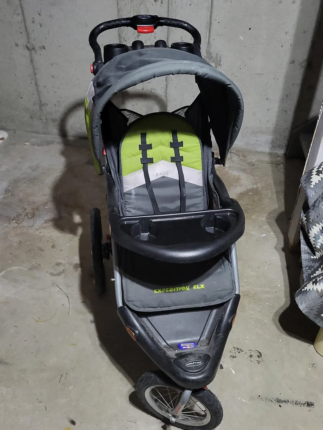 This Baby Trend Expedition ELX jogging stroller comes in grey and lime green. It features a parent tray with speakers, two cup holders and a child tray. Large all-terrain wheels make it easy to manoeuvre. Perfect for outdoor adventures!