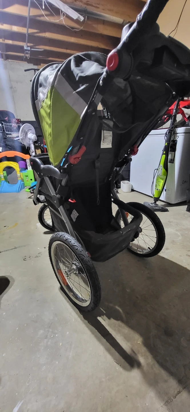 This Baby Trend Expedition ELX jogging stroller comes in grey and lime green. It features a parent tray with speakers, two cup holders and a child tray. Large all-terrain wheels make it easy to manoeuvre. Perfect for outdoor adventures!