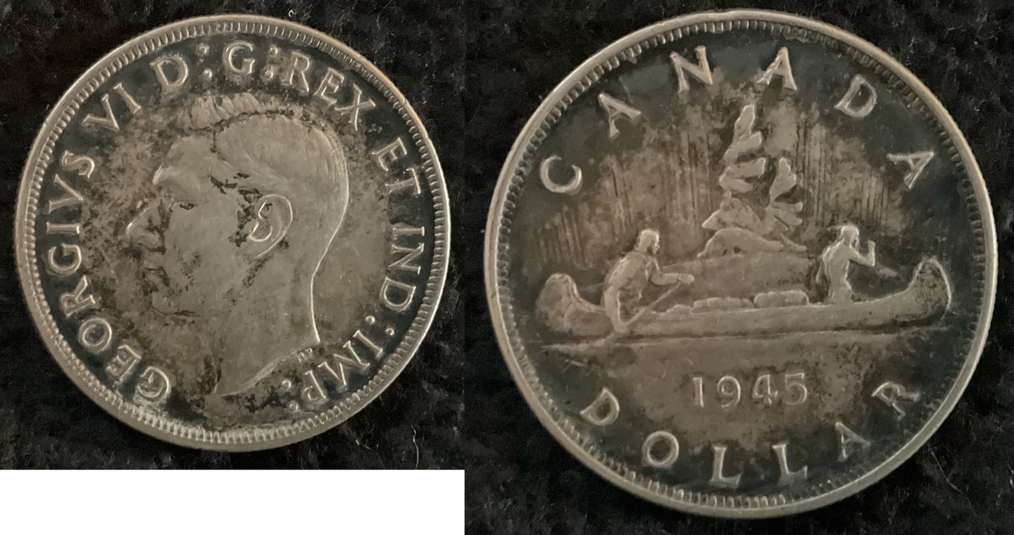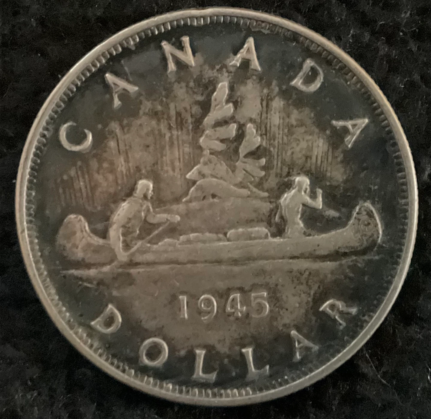 Selling a 1945 Canadian silver dollar coin. It features King George VI on one side and voyageurs in a canoe on the other. Only 38,000 were circulated. The silver content alone makes this a valuable coin.
