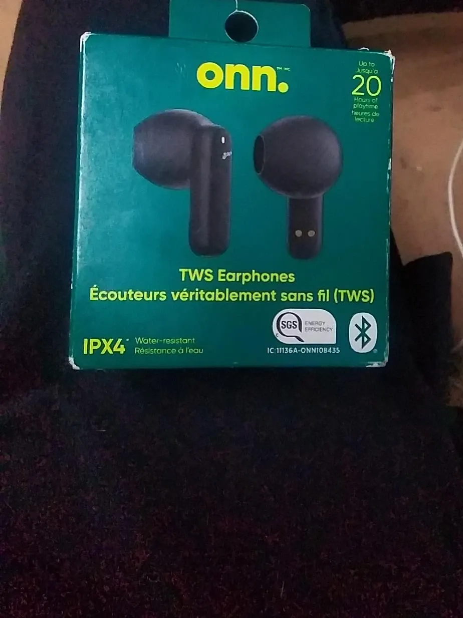 Onn. TWS earphones in black. They offer up to 20 hours of playtime and are IPX4 water-resistant. Perfect for workouts or commutes!