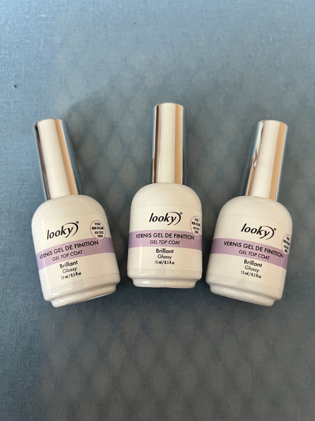 Selling Looky Vernis Gel de Finition Gel Top Coat. It's a glossy, brilliant finish in a 15ml bottle. Perfect for adding that final touch to your nails!